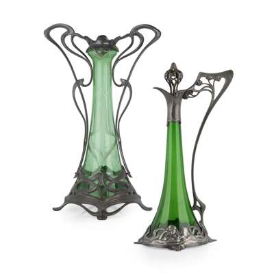 pewter and glass, stamped maker's marks, 38.5cm high; together with a WMF TWIN-HANDLED VASE, peter and etched glass, 46.5cm high (2)