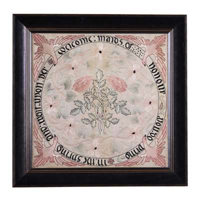 The outer border of the roundel is inscribed with the opening lines of Robert Herrick’s (1591-1674) poem ‘Welcome, maids of honour, you do bring in the Spring and wait upon her’.