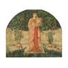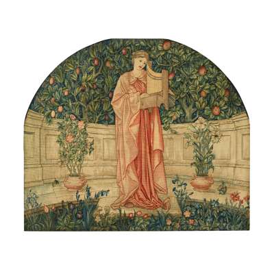 The final design for St Cecilia was a collaboration between Edward Burne-Jones and Henry Dearle, a former pupil of William Morris who later became the chief designer for Morris & Co. in 1890. Burne-Jones created the figure, while Dearle designed the fruit trees and balustrade. The design for this version of St Cecilia was first used in a stained-glass window for Morris & Co. in 1873, which now features in the South transept window of Jesus College Chapel, Cambridge. The figure is nearly identical to the St Cecilia in the tapestry offered here in terms of pose, drapery, and expression, and was chosen for the simplicity of the drapery. A slightly different version of St Cecilia was woven a year earlier, in 1887, as part of a series of seven single-figure panel tapestries, also adapted from existing Burne-Jones stained-glass designs. Like those works, this lunette includes Burne-Jones' figure set within Dearle’s intricate millefleur flower and foliage patterns, with the curved balustrade helping to delineate the figure.