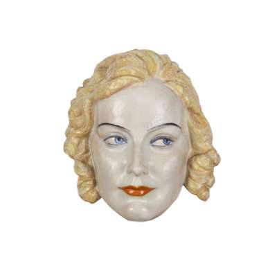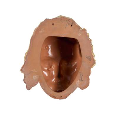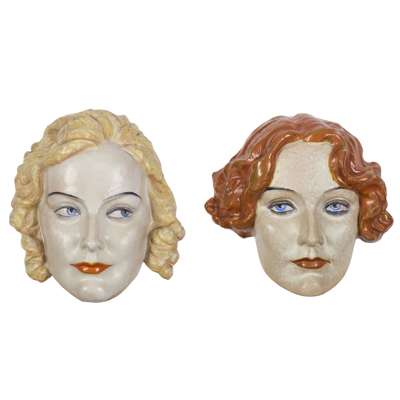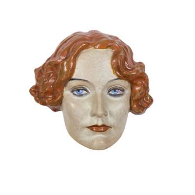 painted and glazed earthenware, stamped factory mark, impressed 940/ 8/ D3 signed PODANY, 20cm wide, 23cm high, 8cm deep, together with; a KERAMOS, VIENNA, WALL MASK, CIRCA 1925, painted and glazed earthenware, impressed 944/8/D2, 22cm wide, 22cm high, 7cm deep (2)