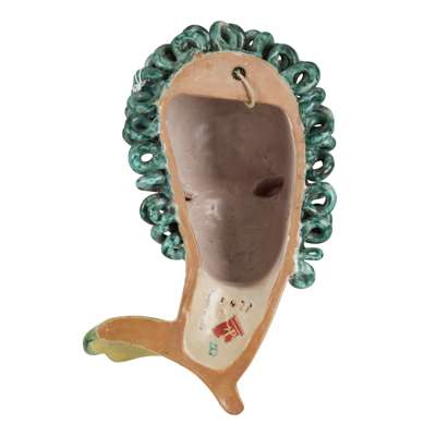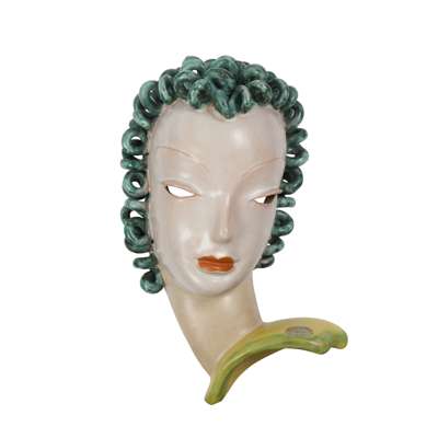 painted and glazed earthenware, 20cm high; together with an ART DECO WALL MASK, by the same artist, painted and glazed earthenware, painted maker's marks, impressed 6427, bears original paper maker's and retailer's labels, 16cm wide, 25cm high, 10cm deep (2)