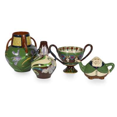 comprising a TEAPOT & COVER, 12cm high; a TWIN -HANDLED TAZZA, no. 3026, 13cm high; a VASE, with four handles, no. 3003, 21.5cm high; together with a TWIN-HANDLED VASE, no. 3387, 18.5cm high, each with printed and painted maker's marks (4)