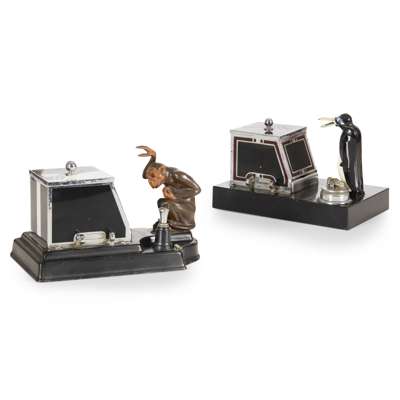 chrome-plated and enamelled metal, comprising; a ‘PIK A CIG’ MONKEY, 20.5cm wide, 14cm high, 12.5cm deep; and a ‘PIK A CIG’ PENGUIN, 20.5cm wide, 14.5cm high, 13cm deep (2)
