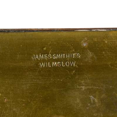 repoussé-decorated copper, brass, with adjustable shade with later beaded fringe, stamped to base JAMES SMITHIES/ WILMSLOW