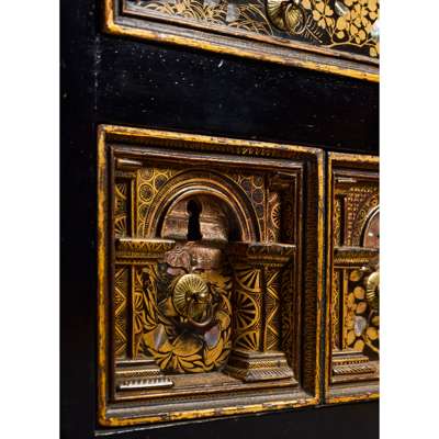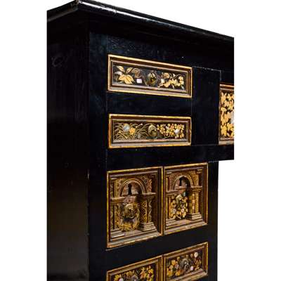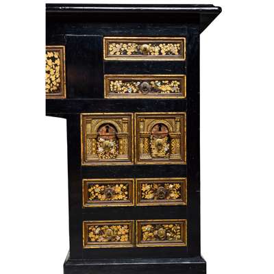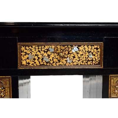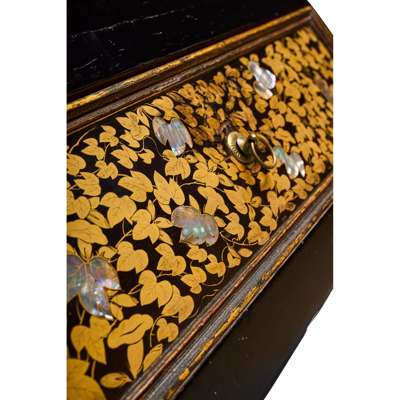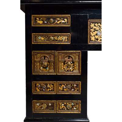 ebonised wood, with Japanese gilded and lacquered drawers, inlaid with mother-of-pearl, brass fittings