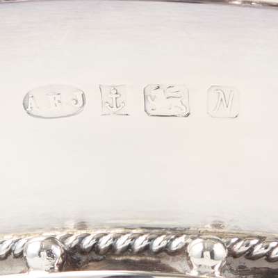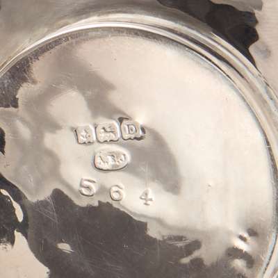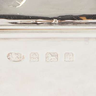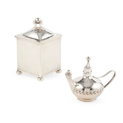 silver and turned wood, stamped maker's mark A.E.J., hallmarked Birmingham 1987, 14.5cm diameter; a LOBED DISH, silver, stamped maker's mark A.E.J., hallmarked Birmingham 1992, 17cm diameter, 287g (dish); a TEA CADDY, 1918, silver, with stamped maker's mark A.E.J., hallmarked Birmingham 1918, 12cm high; and a TABLE LIGHTER, silver, with stamped maker's mark A.E.J., hallmarked Birmingham 1928, 8.5cm high, 257g (4)