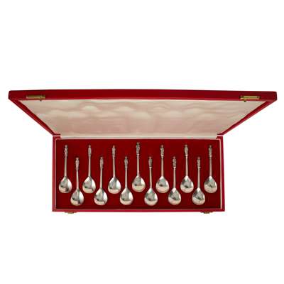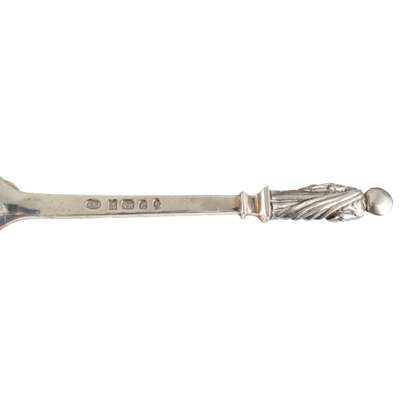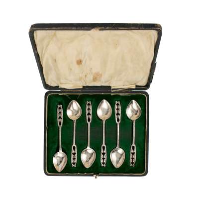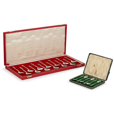 silver, with blue glass liners, comprising a SALT & PEPPER POT, each 6cm high; a MUSTARD POT, 5cm high; and a PAIR OF SALTS, 5.2cm diameter, each with stamped maker's marks A.E.J., hallmarked Birmingham 1932; together with a MATCHED CRUET SET, silver, with blue glass liners, comprising a lidded MUSTARD POT, hallmarked Birmingham 1922, 7cm diameter; a PEPPER POT, hallmarked Birmingham 1919, 6cm high; and a SALT, hallmarked Birmingham 1921, 7cm diameter, 382g; together with a CASED SET OF THIRTEEN APOSTLE SPOONS, 1977, silver, each inscribed with the name of apostle and with cast figural terminals, stamped maker's marks A.E.J. hallmarked Birmingham 1977, 15cm long, 450g; together with a CASED SET OF SIX TEASPOONS, silver, stamped maker's marks A.E.J. hallmarked Birmingham 1917, 73g (27)