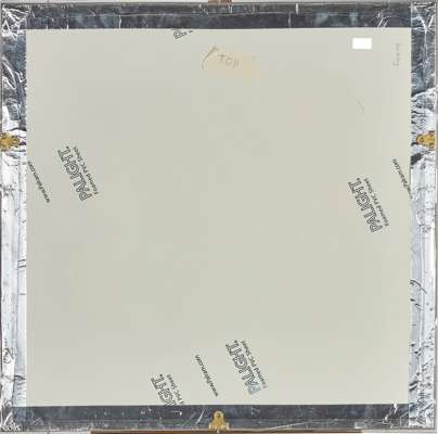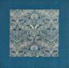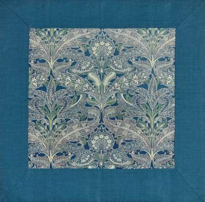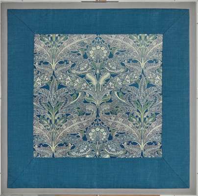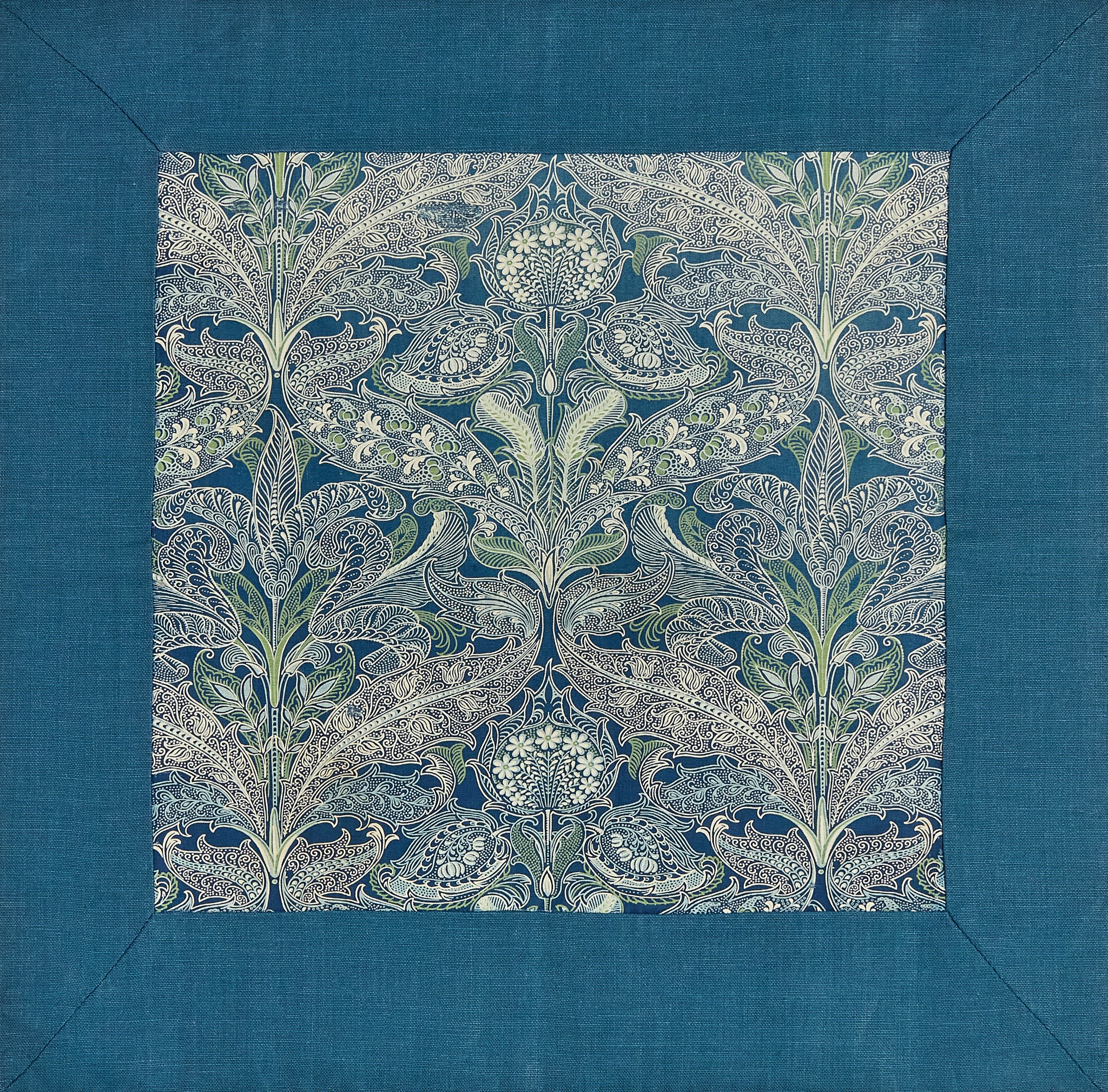 woven cotton, discharge-printed, within a blue linen border, mounted on cotton covered board, within a Perspex box frame