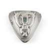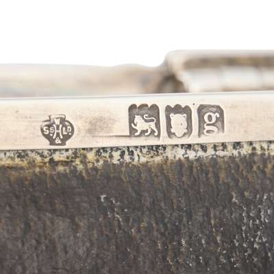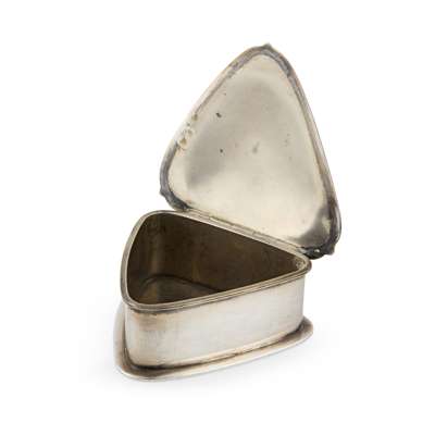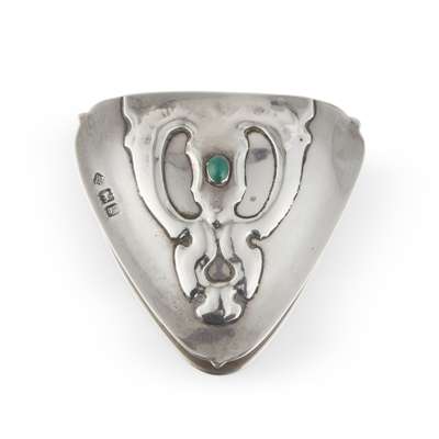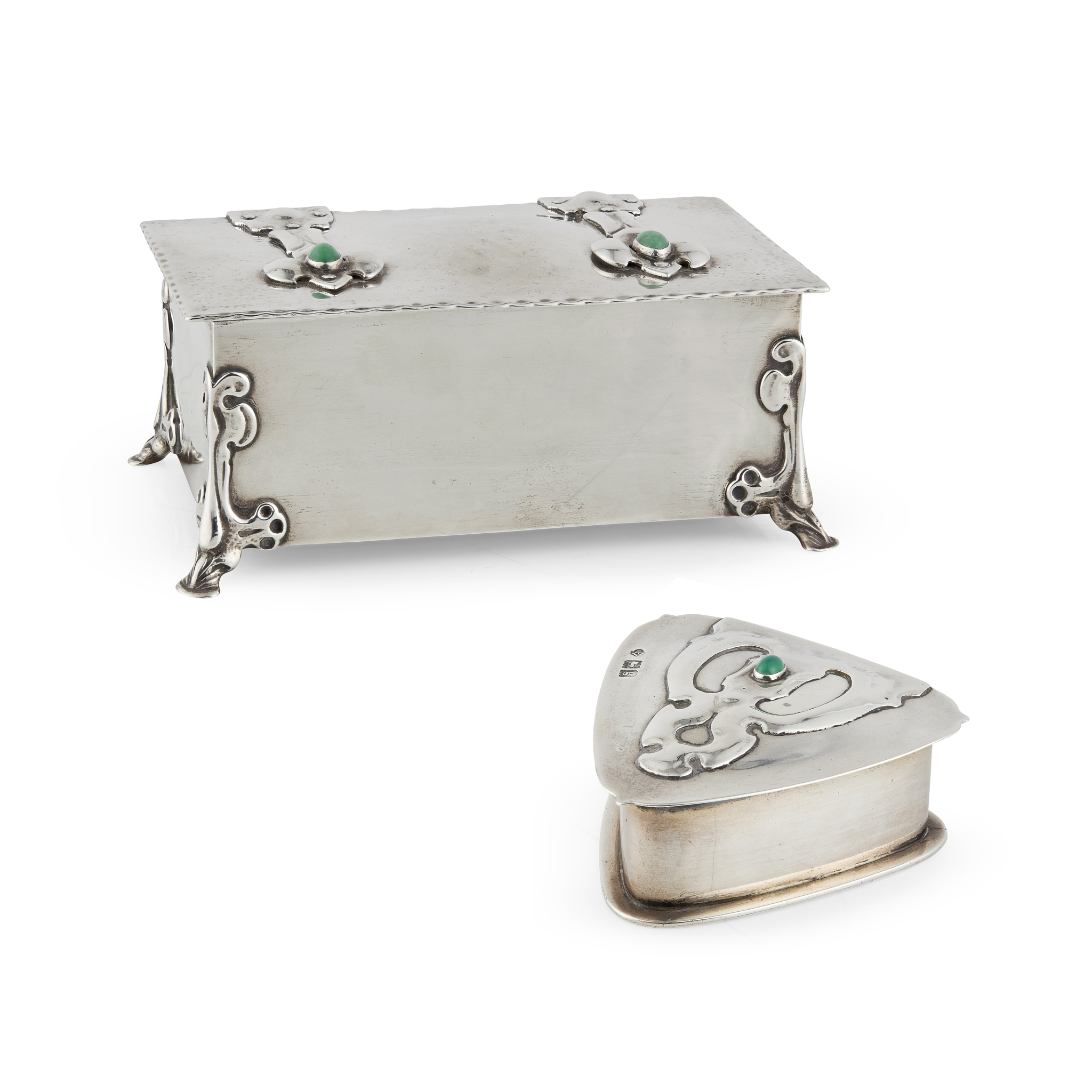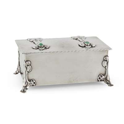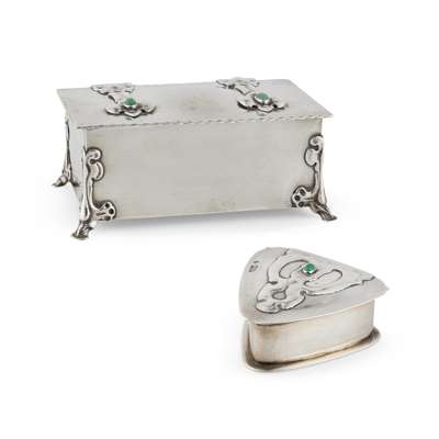 silver set with chrysoprase cabochons, cedar lining, stamped maker's mark, hallmarked London 1902, 16.5cm wide, total weight 595g; together with KATE HARRIS (1878-1949) FOR WILLIAM HUTTON & SONS LTD., ARTS & CRAFTS TRINKET BOX, 1902, silver, set with chrysoprase cabochon, stamped maker's marks, hallmarked London 1902, 7cm across, total weight 102g (2)