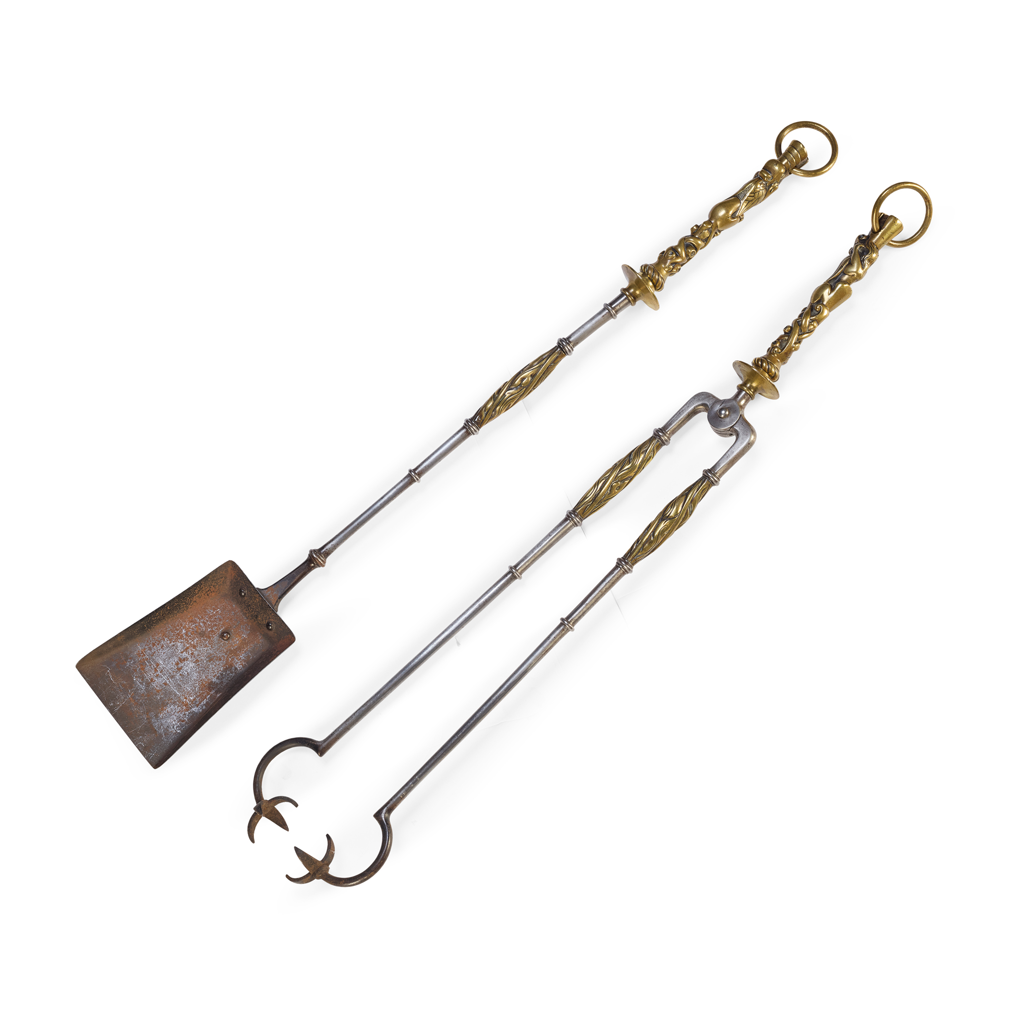 brass and steel, comprising; a PAIR OF COAL NIPPERS, 91cm long, and an ASH SHOVEL, 90cm long (2)