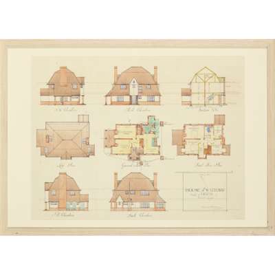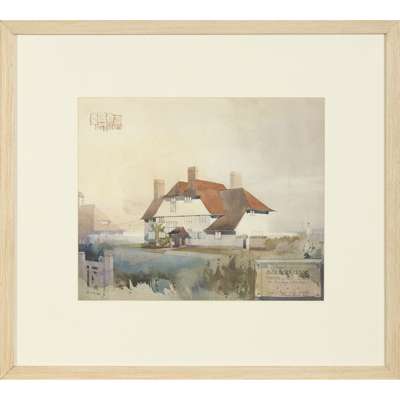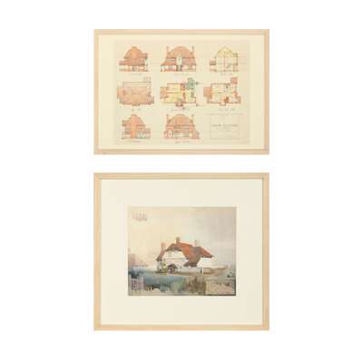 watercolour, pen and ink, signed and dated, 28cm x 34.5cm (frame size 50.5cm x 56cm); together with ‘HOUSE AT WATFORD’, architectural plans, pen and ink, signed, 41.5cm x 54.5cm (frame size 50.5cm x 70.5cm) (2)