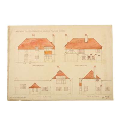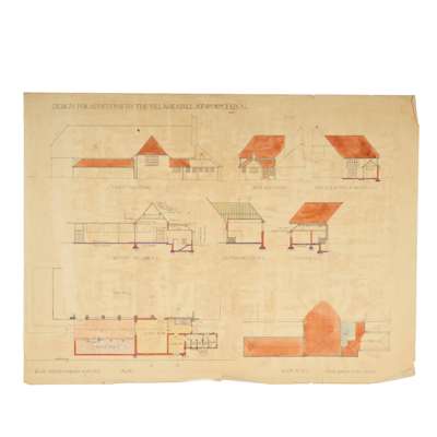 PROPERTY OF AUDLEY MACKWORTH, TILFORD: COTTAGE AT TILFORD, SURREY, FOR AUDLEY MACKWORTH ESQR, DETAILS, watercolour and graphite, signed and dated 1893, 50.5cm x 68.5cm; ADDITIONS TO MR. MACKWORTH'S HOUSE AT TILFORD, SURREY, 2 designs, pen and ink, watercolour and graphite, 55cm, x 76.5cm; PROPOSED ADDITIONS TO MR. MACKWORTH'S BUNGALO [SIC] AT TILFORD, pen and ink, watercolour and graphite, 36.5cm x 56cm; PROPOSED ADDITION TO MR. MACKWORTH'S BUNGALO [SIC] AT TILFORD, brown ink on glassine, 32cm x 46cm; and 1 similar (in brown ink on glassine, untitled).