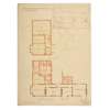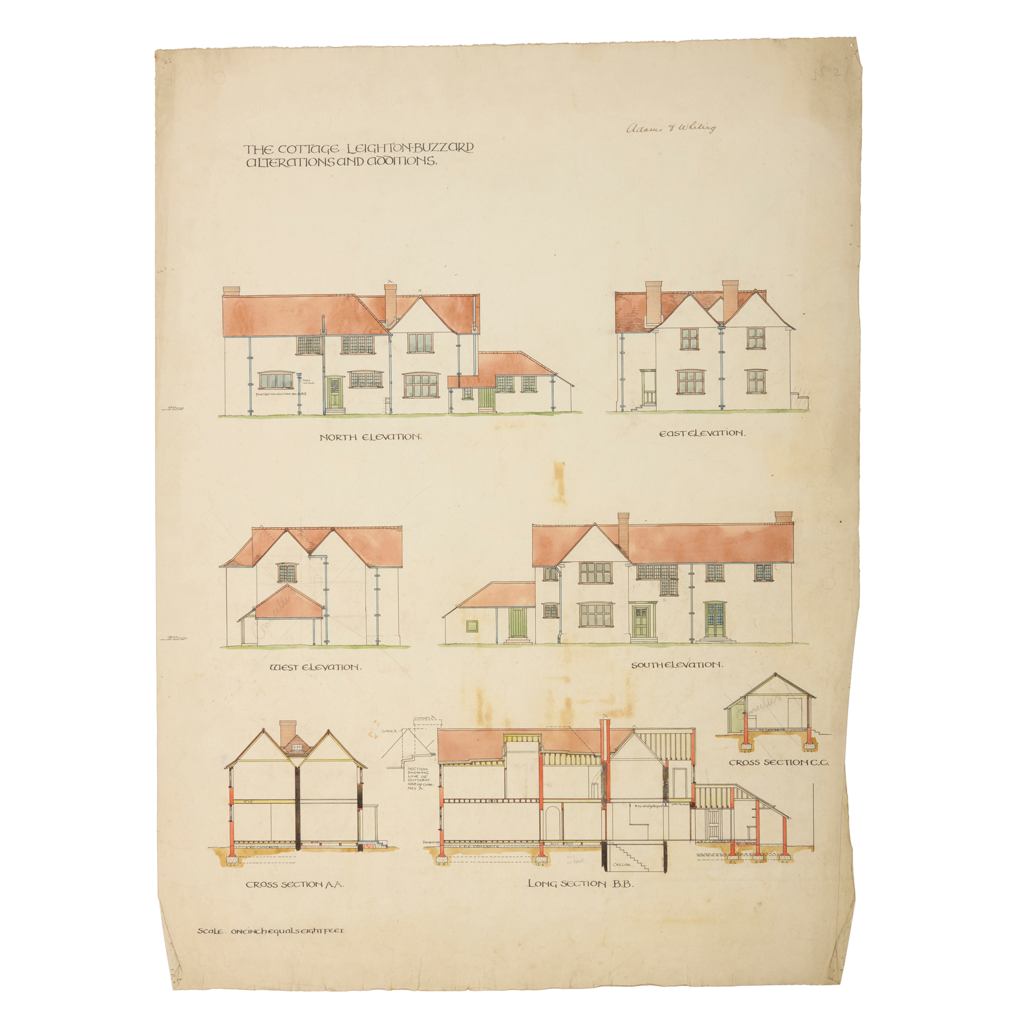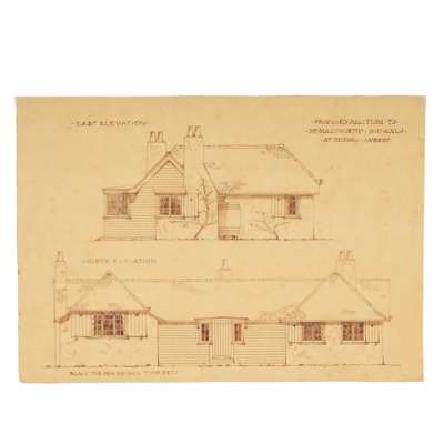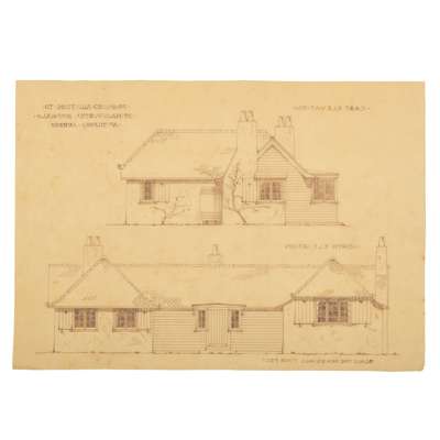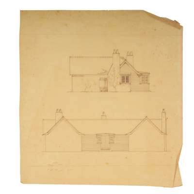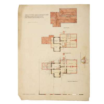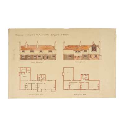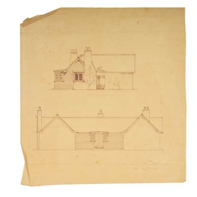 Together with 2 further sheets of designs (THE COTTAGE, LEIGHTON BUZZARD, ALTERATIONS AND ADDITIONS FOR AUDLEY MACKWORTH, ESQ., and THE COTTAGE, LEIGHTON BUZZARD, ALTERATIONS AND ADDITIONS, apparently the same building, both pen and ink and watercolour with traces of graphite, 68cm x 51cm)