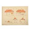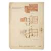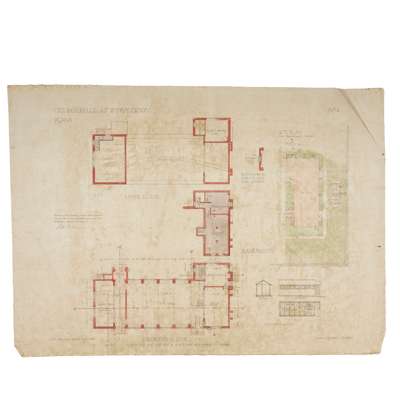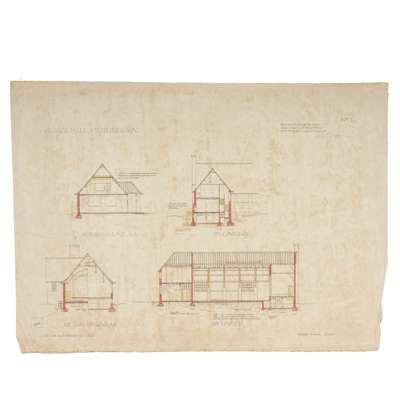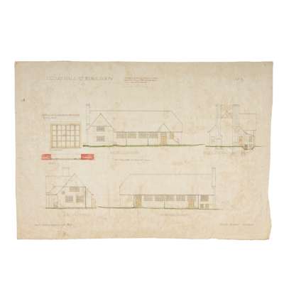 VILLAGE HALL, WORPLESDON: 4 designs, pen and ink, watercolour and graphite, 3 on linen (these annotated ‘This is one of the drawings referred to in a contract between Sir L. E. Halsey K.B.E. and Messrs Tribe & Robinson, dated 16 December 1921’), discolouration, the design on paper with nicks and tears to edges, 56.5cm x 77cm.