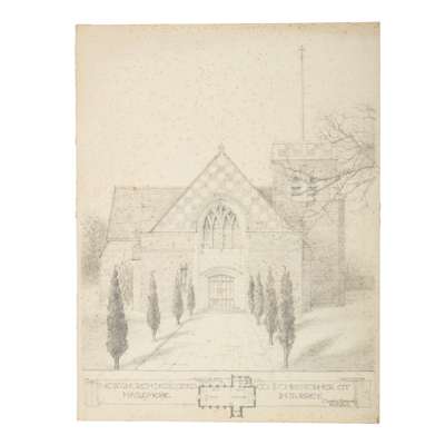 NEW CHURCH DEDICATED TO S CHRISTOPHER AT HASLEMERE IN SURREY, graphite, signed ‘Charles Spooner architect’, 68 x 52cm, spotted.