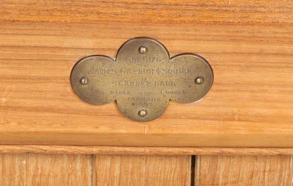 carved oak, velvet covered cushions, with brass plaque to the back inscribed ‘Gifted by James Taylor Esquire of Starley Hall, an elder of Greenside Church, January 1886’