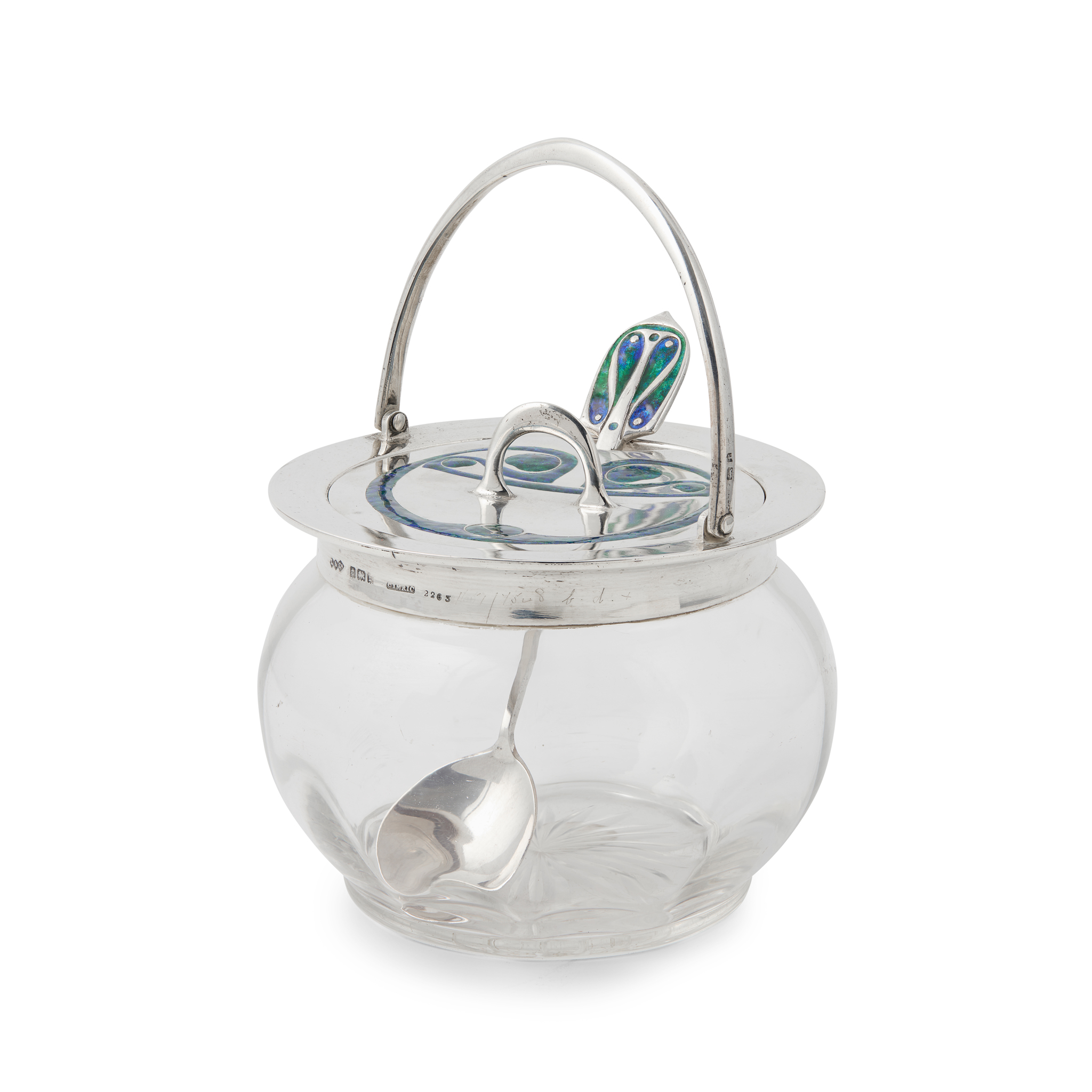 silver, glass and enamel, stamped retailer's mark L & CO, CYMRIC 2263, hallmarked Birmingham 1905, spoon hallmarked Birmingham 1906