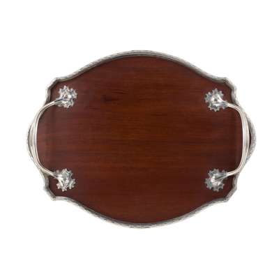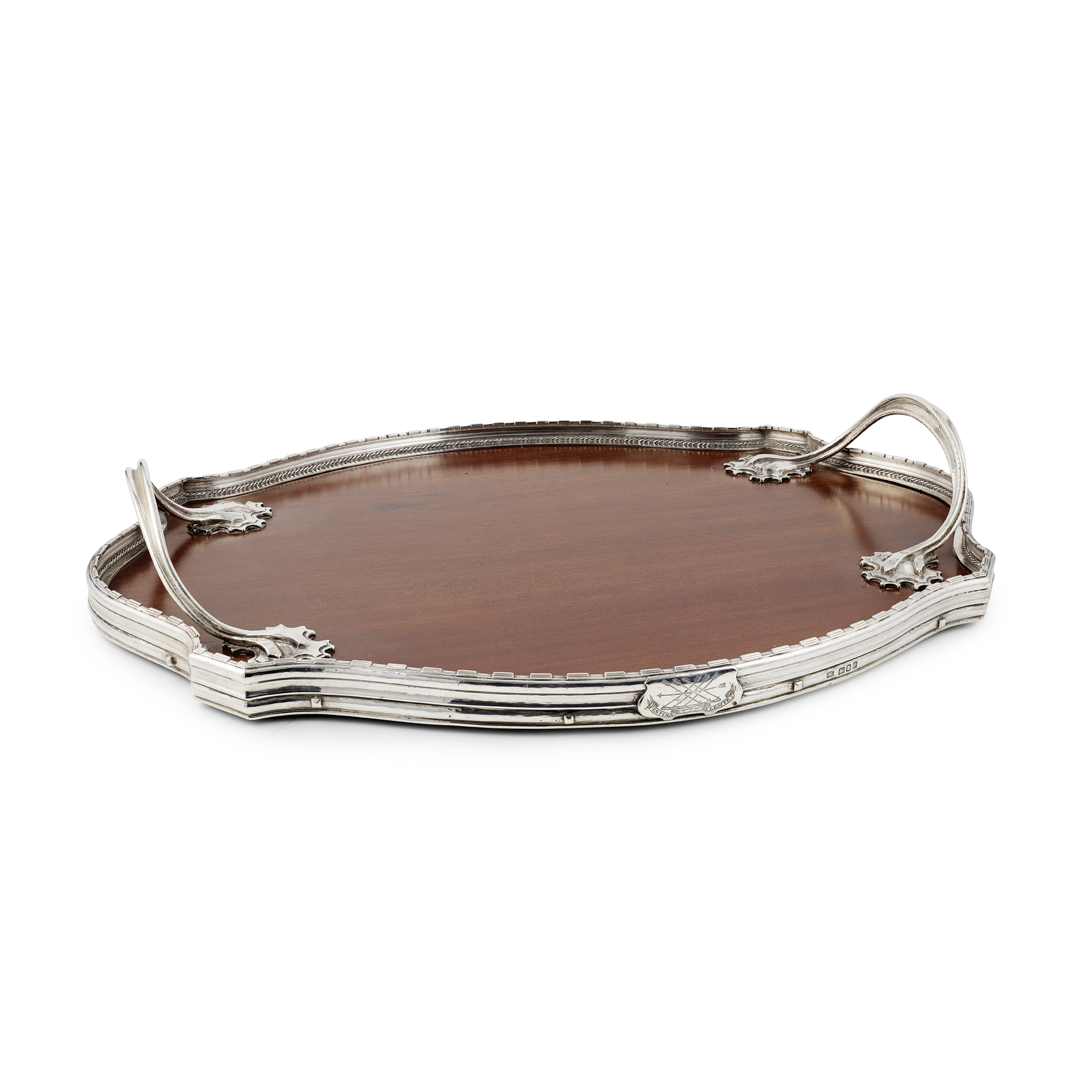 mahogany with silver mount, bears engraved coat of arms with motto FESTINA LENTE, stamped maker's mark OR, hallmarked London 1922