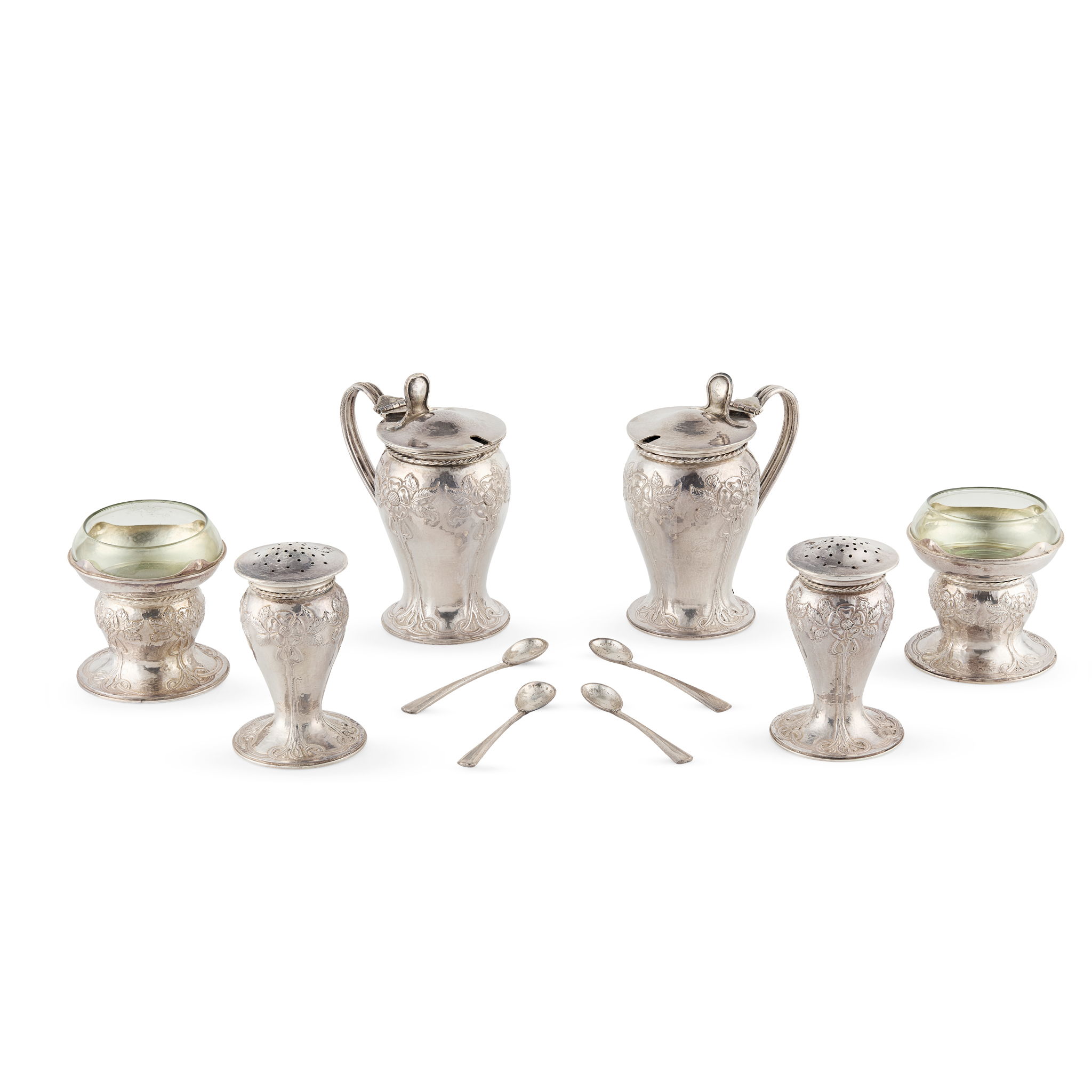 silver, stamped maker's mark AC, hallmarked London 1925, comprising; a PAIR OF LIDDED MUSTARD POTS, each with glass liner, 11cm high; a PAIR OF PEPPERS, 8.5cm high; a PAIR OF SALTS, each with green glass liner, 6.9cm high including liner; together with a PAIR OF SALT SPOONS, 7.5cm long; a PAIR OF MUSTARD SPOONS, 8.4cm long; with two spare green glass mustard pot liners and one spare salt liner, total weight 723g (13)