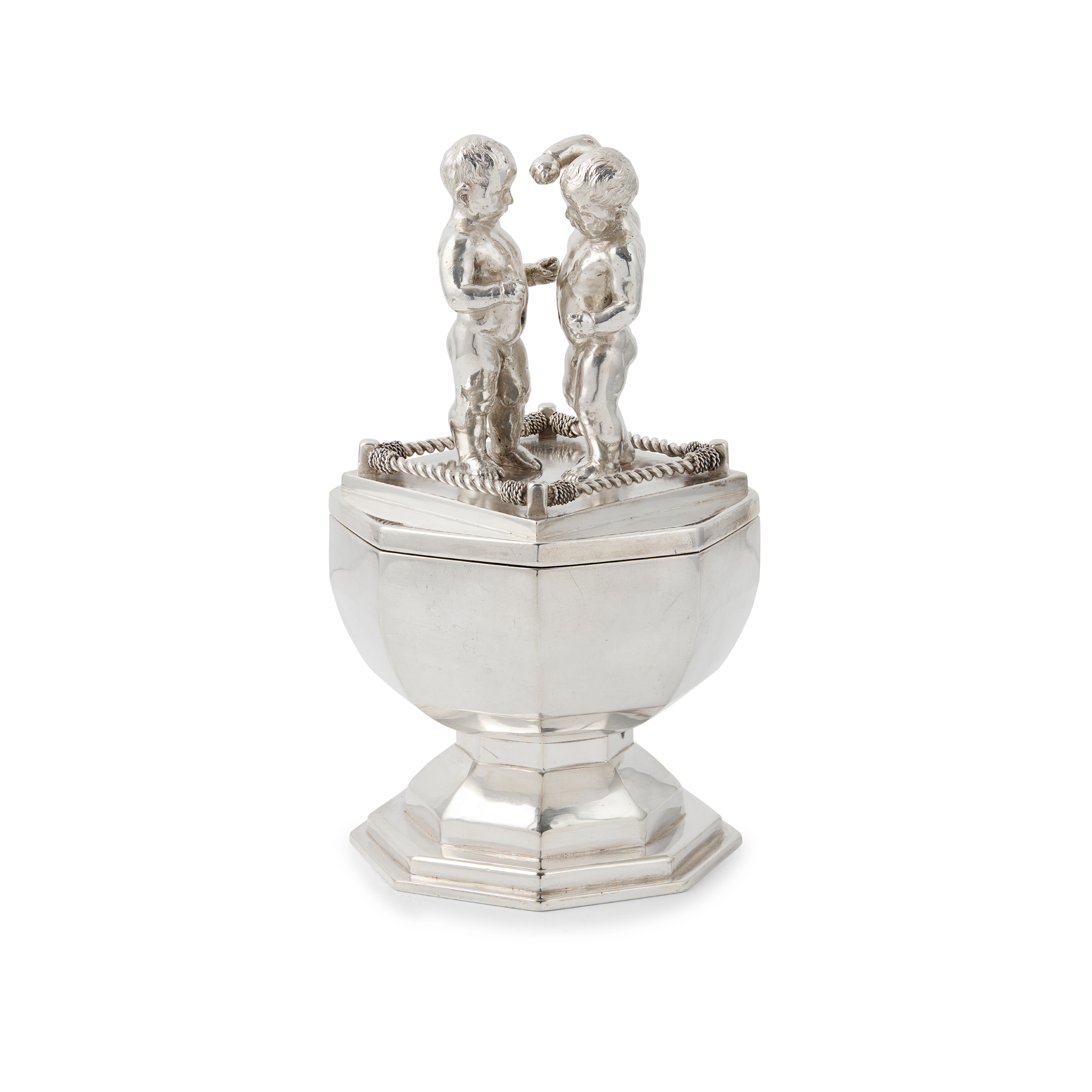 silver and silver gilt, with boxing putti finial, stamped maker's mark HGM, hallmarked London 1930, weight including handle 836g