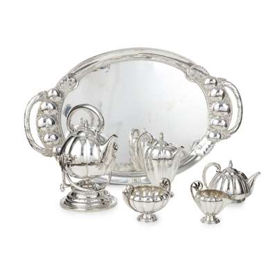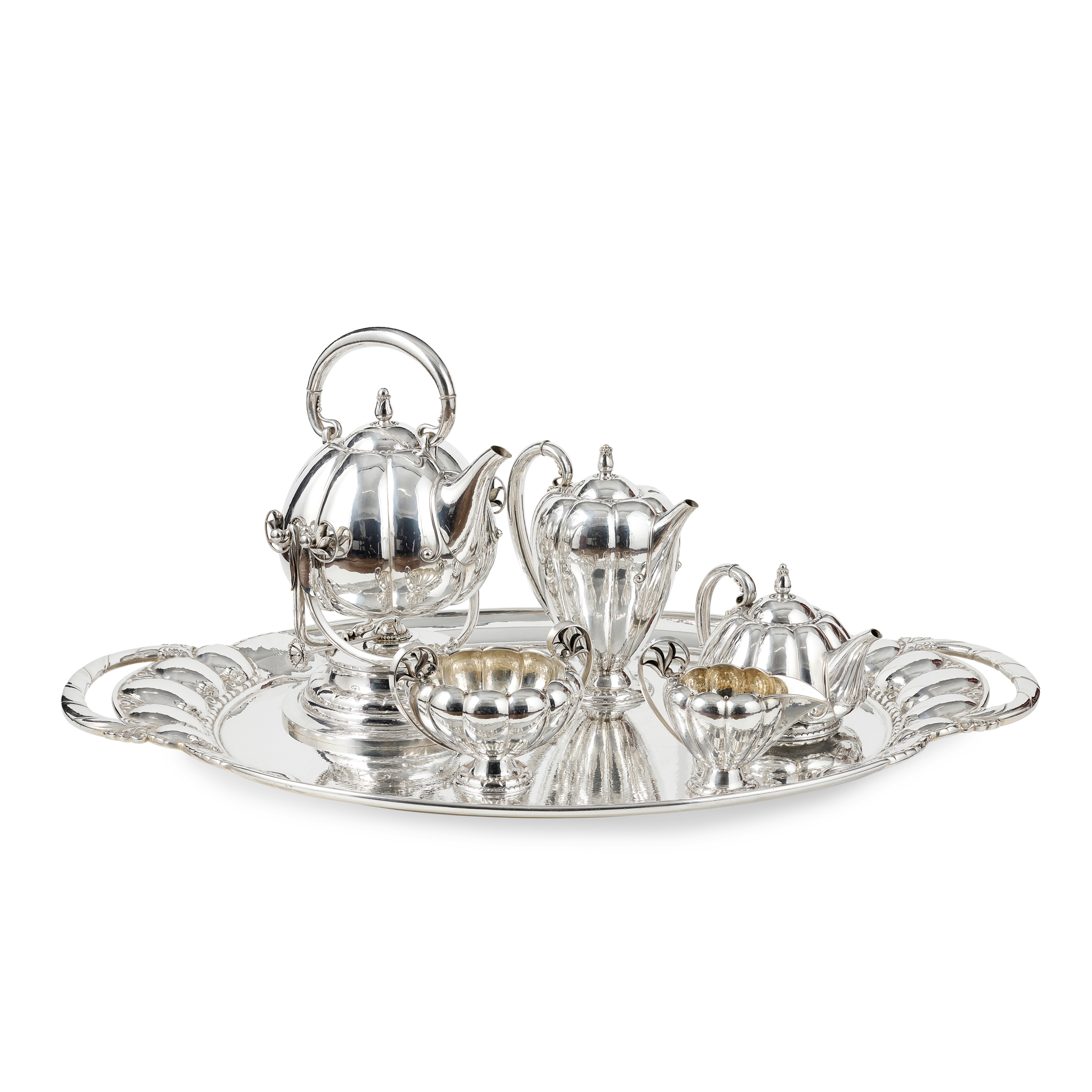 silver, stamped maker's mark GEORG JENSEN DENMARK STERLING 179 (the set) and 159 (the tray), comprising; a COFFEE POT, 23.5cm high; a TEAPOT, 14.5cm high; a SPIRIT KETTLE, STAND AND BURNER, the kettle 24.5cm high, total height 35cm; a SUGAR BOWL, 17.8cm wide across handles; a MILK JUG, 12.4cm high; together with an associated SERVING TRAY, 86.5cm wide, 53.5cm deep, weight 10,799 g (6)