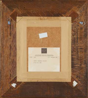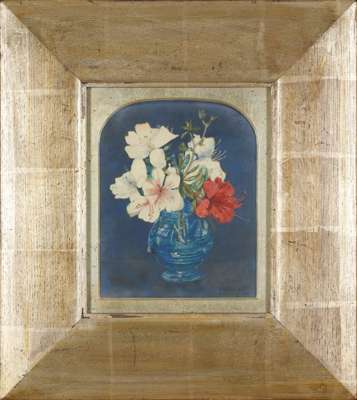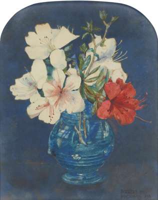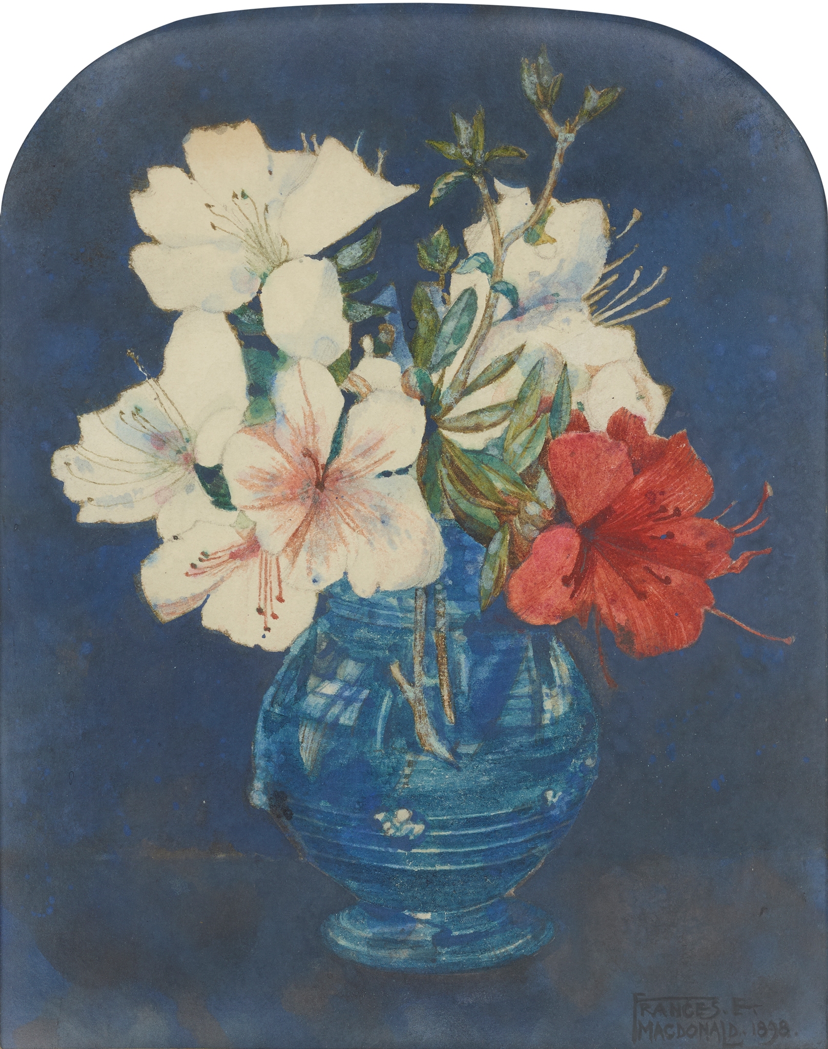 This watercolour dates from 1898, just prior to Frances’s marriage to Herbert Macnair and is atypical of her surviving work. Just two years prior, she had produced ‘Eve’ in the symbolist style and rejecting the traditional iconography associated with the biblical figure. Indeed, her early poster work with Margaret provided radical re-imaginings of female subjects; women depicted by women redefining their visual identity at the turn of the century. By comparison therefore, ‘A Blue Vase’ is a departure, with its traditional subject matter and relatively naturalistic execution. The work is none the less skillfully executed, the azaleas sitting with a spontaneous feel to their arrangement, the eye being drawn to the singular red flower, whose colour is taken up in the rusty hues of the neighbouring foreground blooms. The title of the work puts the focus on the vase, rather than the flowers it contains, and the reflections across the glass surface give hints of the room beyond.
