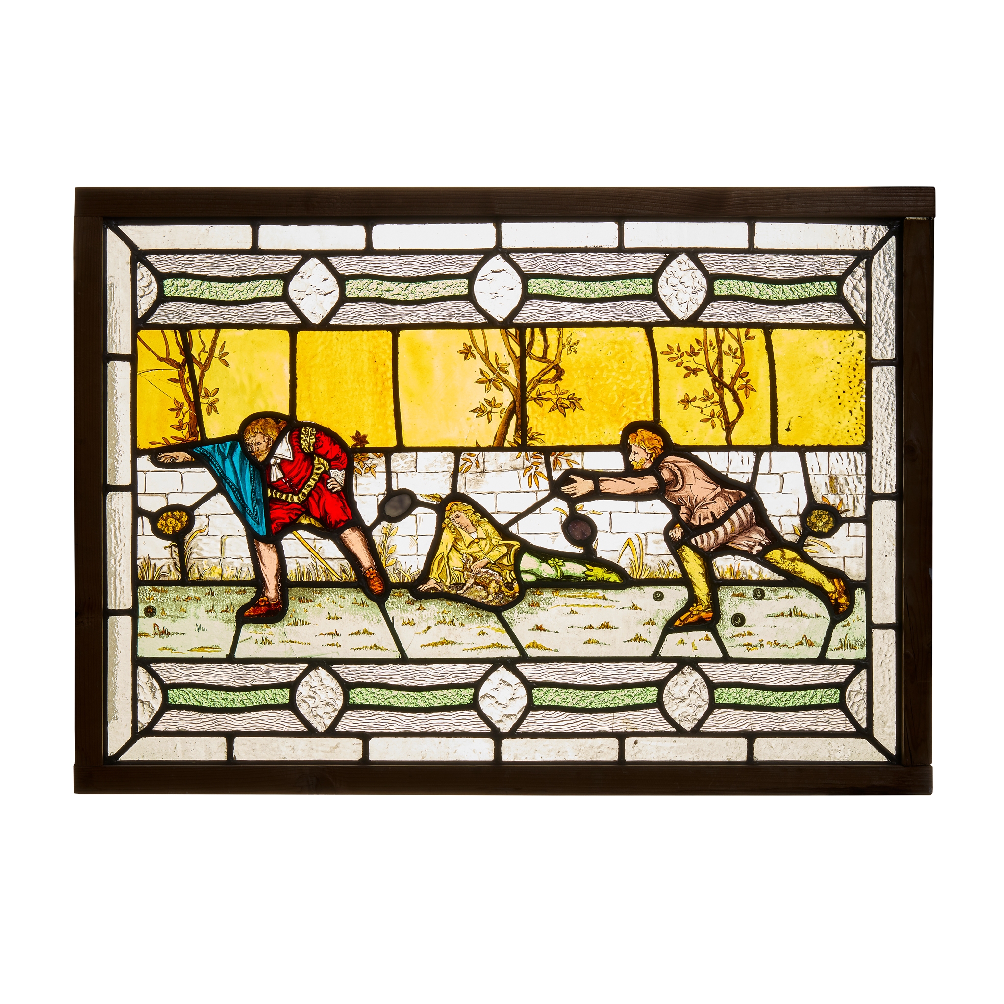 painted, stained and leaded glass, later pine frame