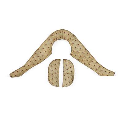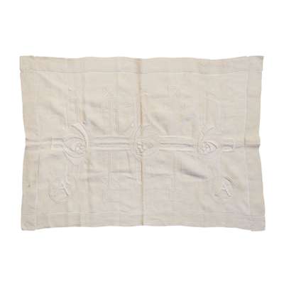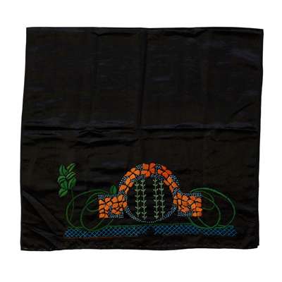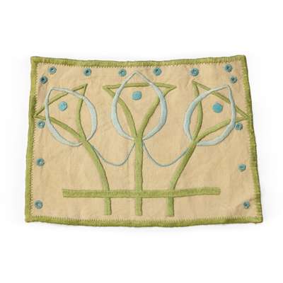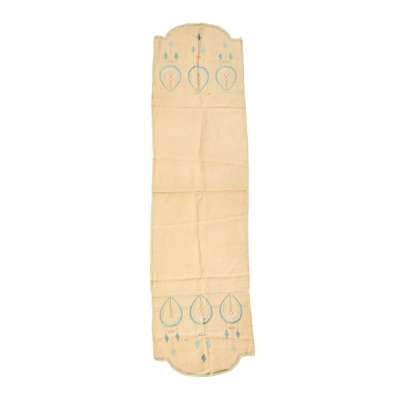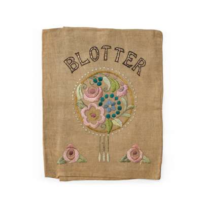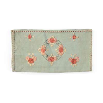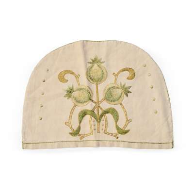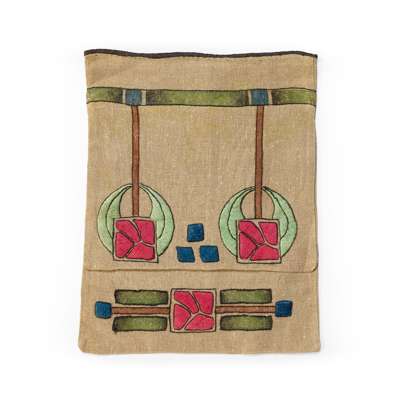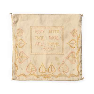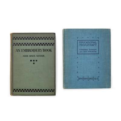 to include; an EMBROIDERED CASE BY ANN MACBETH, 31.5cm x 24cm; a TEA COSY, 26.5cm x 38cm; a BLOTTER, 30cm x 24cm (closed); a BLACK SATEEN PANEL, 55cm x 58cm; a TABLE RUNNER, 75cm x 44.5cm; a WHITEWORK PANEL, 68cm x 103cm; a COLLAR AND CUFF, collar 36cm x 48cm; TWO FURTHER EMBROIDERIES, the larger 24cm x 35cm; TWO CUSHION COVERS, one with motto RESTE AFTER TOYLE PORTE AFTER STORMIE SEAS, 37cm square; TWO BAGS, the larger 33cm x 26cm; a machine embroidered COLLAR AND PAIR OF CUFFS; a BEDSPREAD, applique and needlework on linen, 249cm x 176cm; a RUNNER, silk threads on a silk ground with satin border, 111.5cm x 37.5cm; SCRAP OF ART NOUVEAU FABRIC, printed cotton, 36cm x 27cm; a TEA COSY, cotton threads on linen, 28cm x 45cm; a PANEL, wool threads on linen, 247cm long, 21cm wide; together with TWO BOOKS, Margaret Swanson and Ann Macbeth, ‘Educational Needlecraft', Longmans Green & Co., 1911; Anne Knox Arthur, ’An Embroidery Book', A. & C. Black Ltd., 1920 (19)