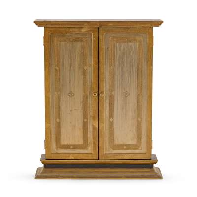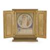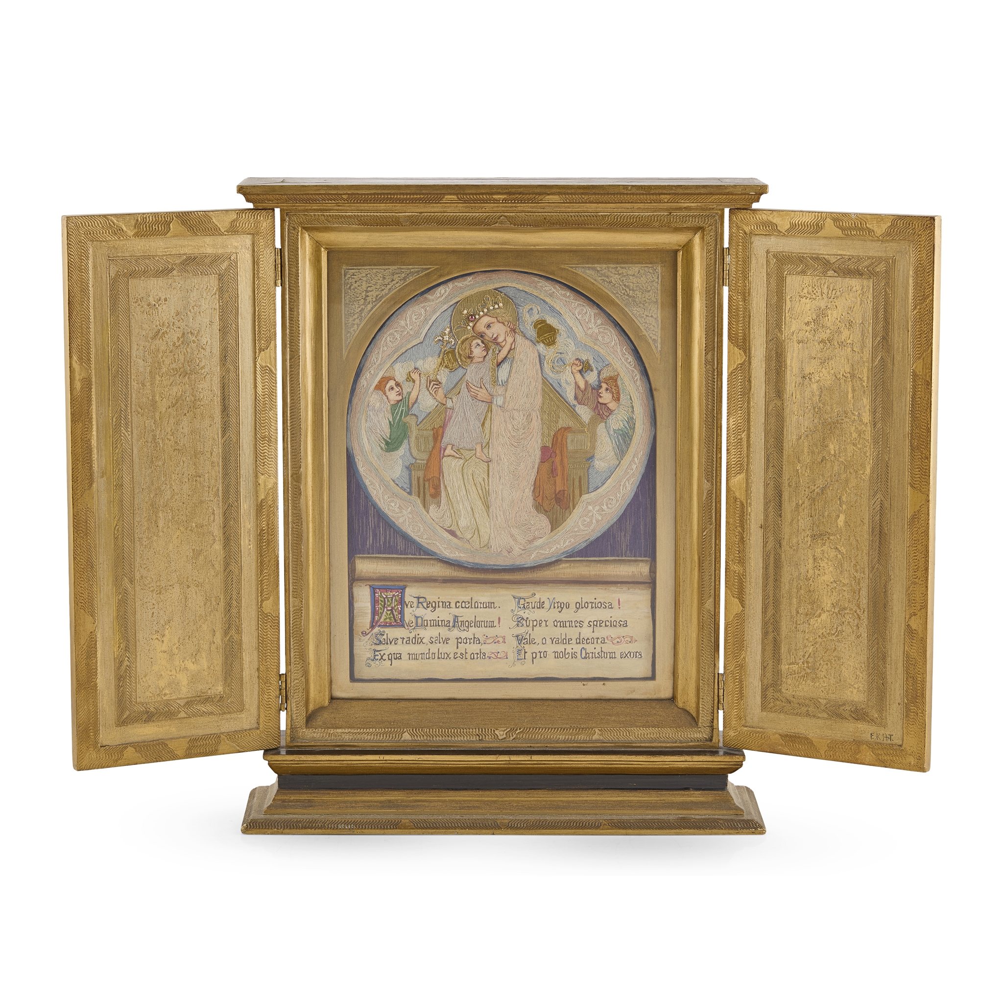 depicting the Virgin & Child with attendant angels, with illuminated inscription AVE REGINA COELORUM....ET PRO NOBIS CHRISTUM EXORS, within gilt painted case and stand with twin doors