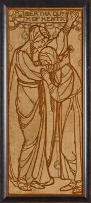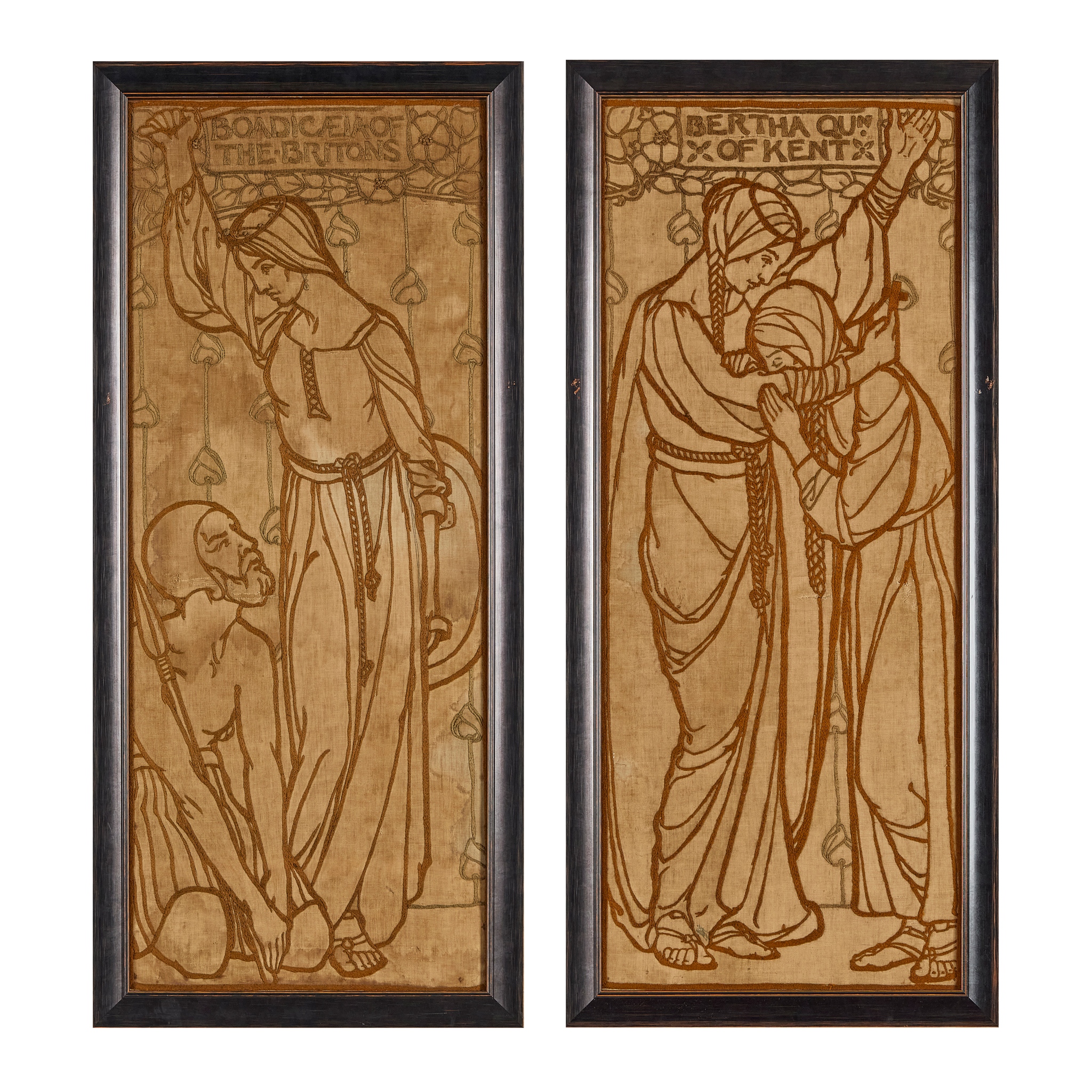 coloured wools on an unbleached linen ground, ‘BERTHA QUN/ OF KENT’ and ‘BOADICAEIA OF/ THE BRITONS’, framed (2)