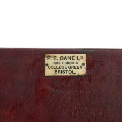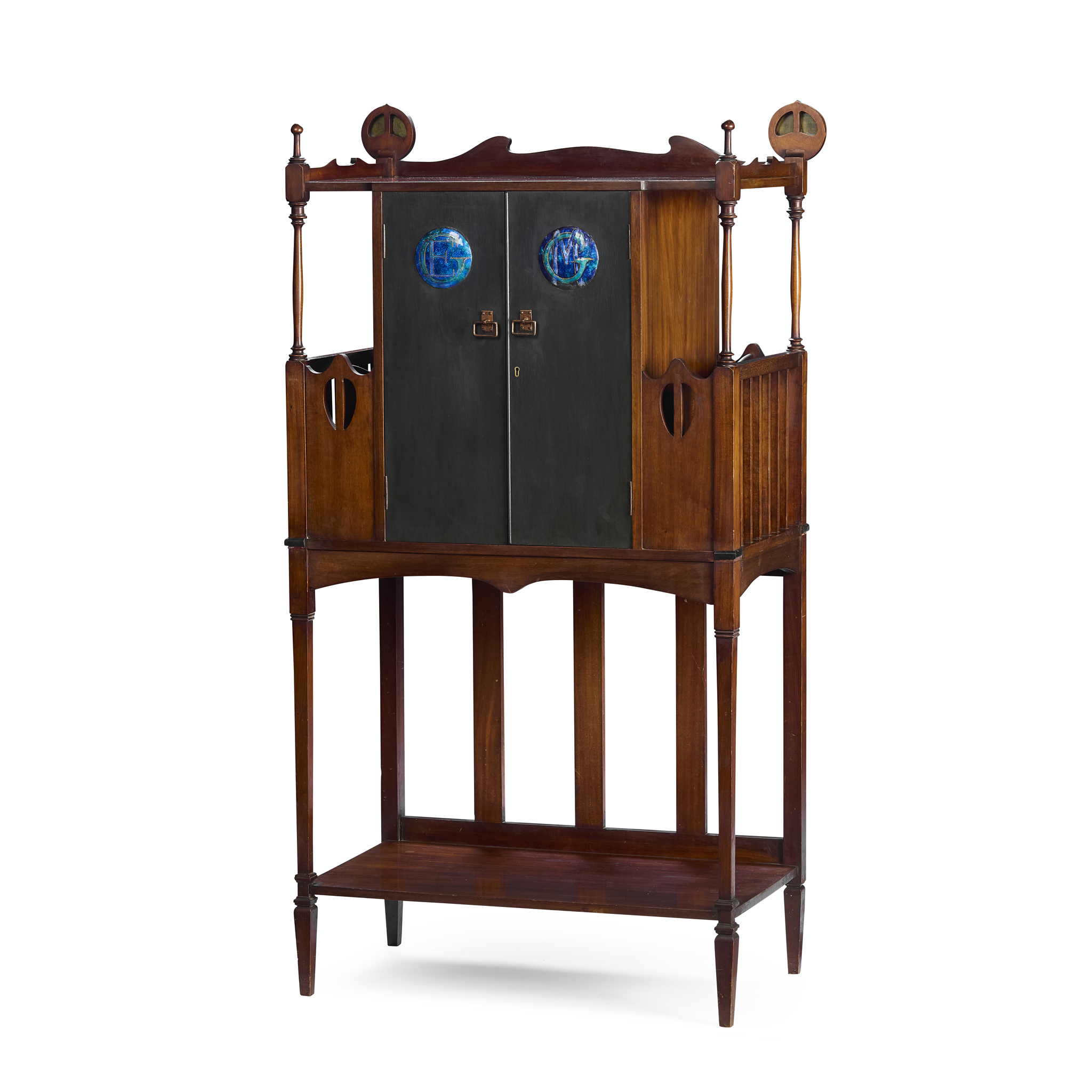 mahogany, with painted doors, set with enamel roundels, bearing initials EG and MG, copper handles, bears retailer's label P. E. GANE LIMITED, BRISTOL