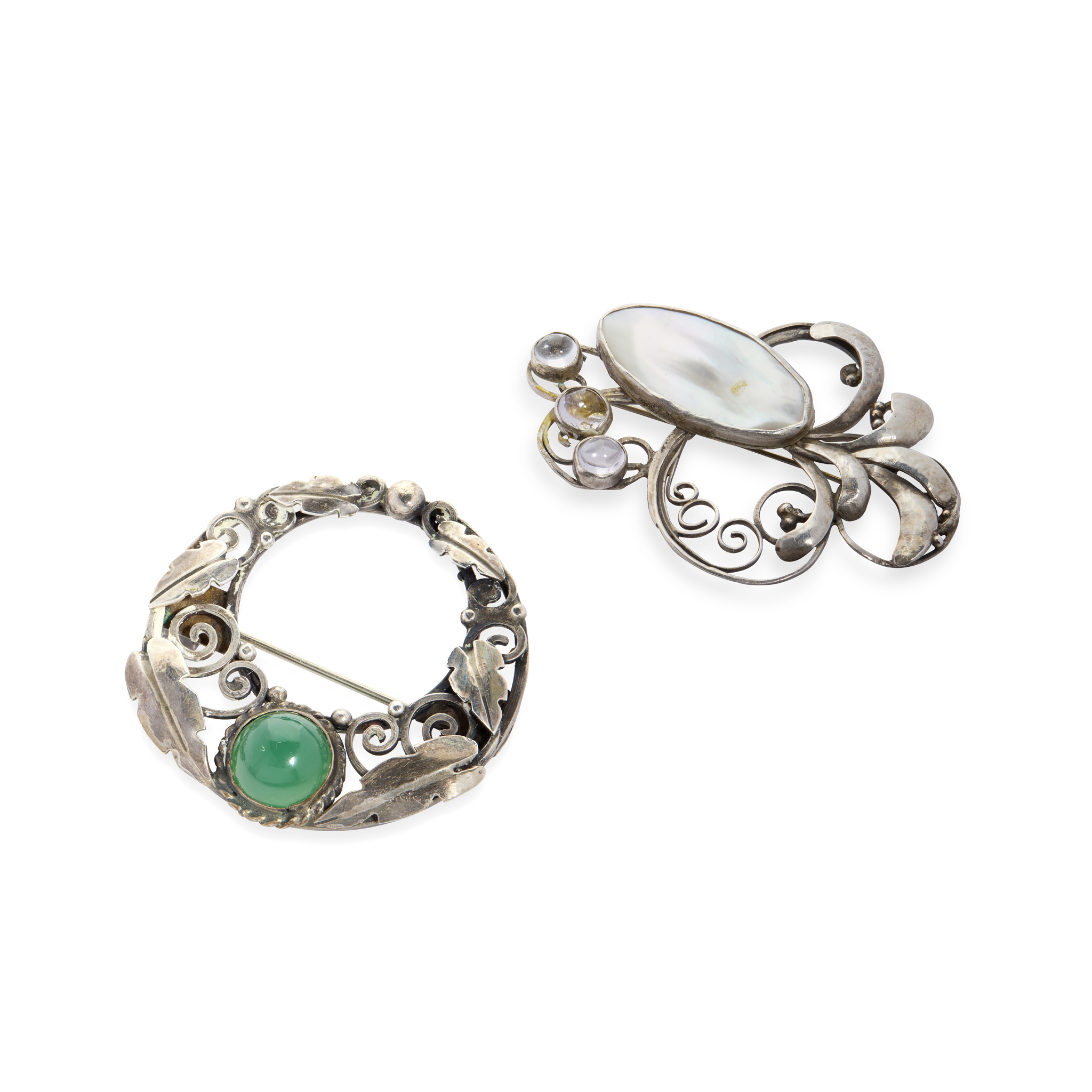 one white metal, blister pearl and moonstone cabochons, engraved verso NORAH CRESWICK, 8.4cm across; and a PENANNULAR BROOCH, white metal set with chrysoprase cabochon, 4.1cm diameter, each within branded box inscribed NORAH CRESWICK/ ARTIST JEWELLER/ 20, HARRISON ROAD/ EDINBURGH (2)