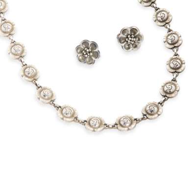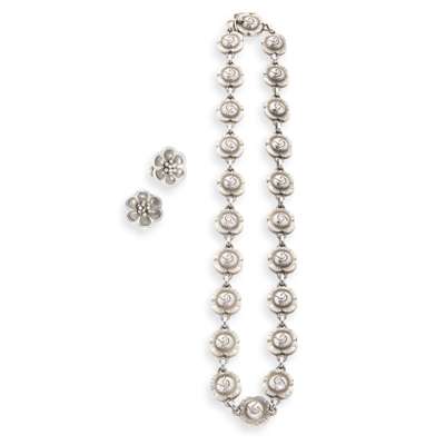 silver, stamped maker's mark, STERLING/ 42B, hallmarked London 1955, 40.5cm long; together with a GEORGE JENSEN MATCHED PAIR OF EARCLIPS, silver, stamped maker's marks, STERLING/ DENMARK/ 67, 1.5cm diameter (3)