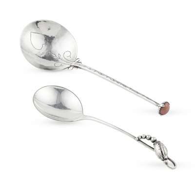 silver, stamped maker's mark GEORG JENSEN, DENMARK, STERLING, G.J. LD/ 925, import marks for London 1923, 14cm long, weight 23g; together with A. E. JONES (1878-1954), silver, with coral knop, stamped maker's mark, hallmarked Birmingham1902, 5.7cm long, total weight 32g (2)