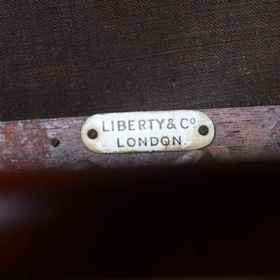 walnut, with original Liberty fabric cover, bears enamel label LIBERTY & Co.