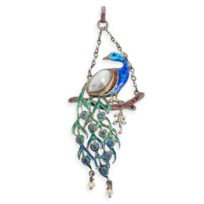 white metal, enamel, blister and seed pearls, sapphire and ruby cut stones