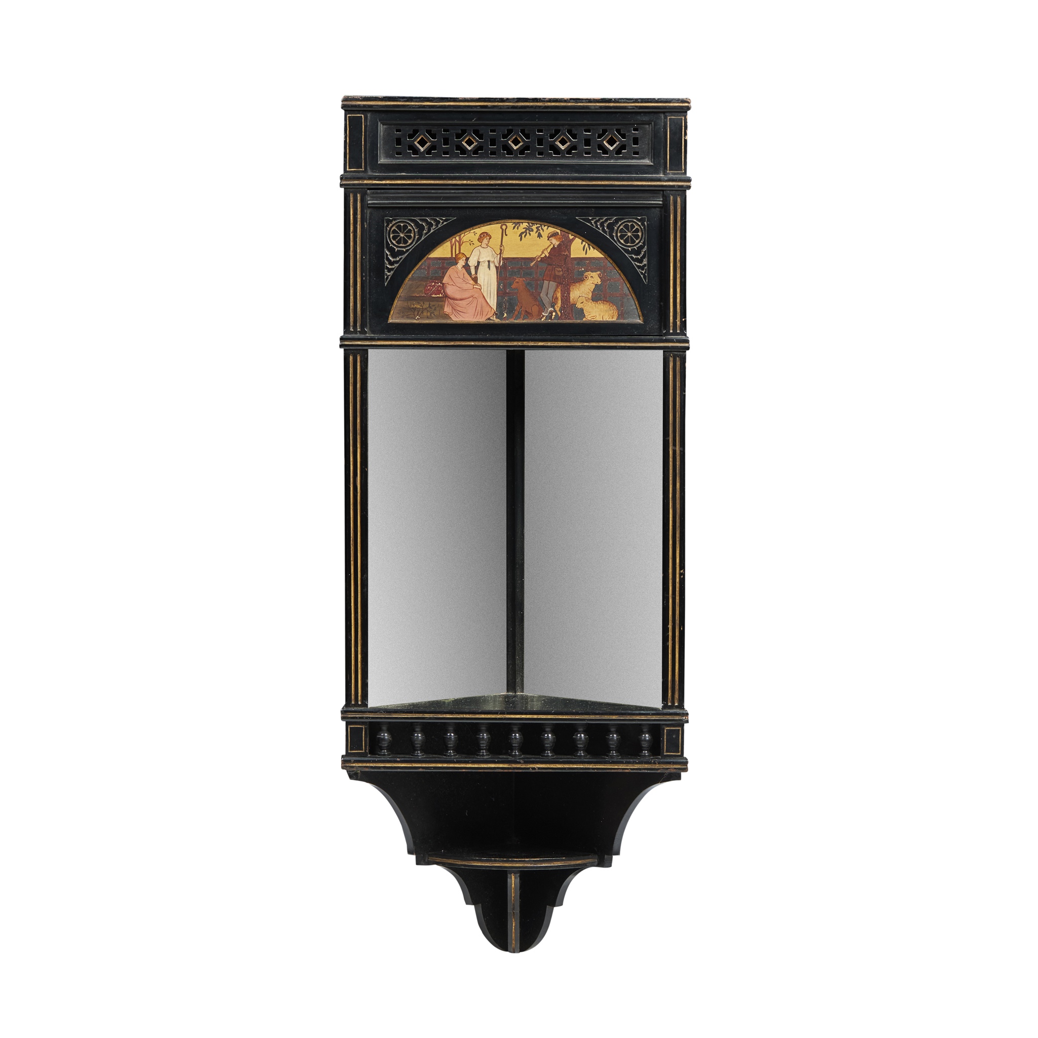 ebonised and gilded wood, with polychrome painted panel and mirror plates