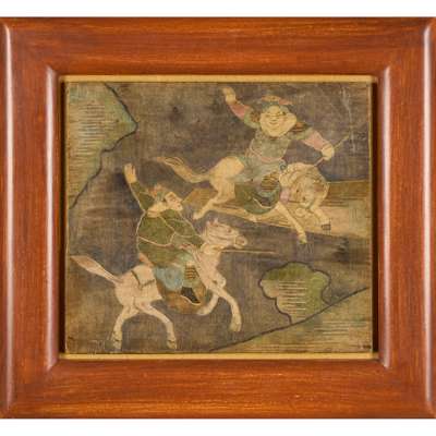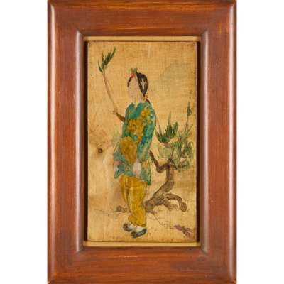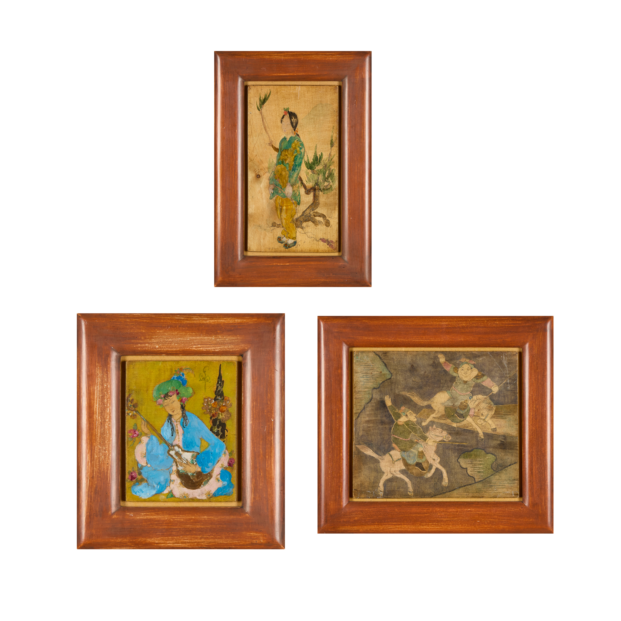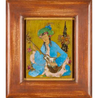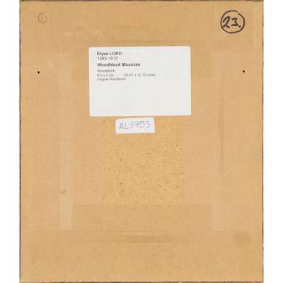 pencil and mixed media on stained wood, framed, 27cm x 15cm (frame size 38.5cm x 26cm); together with two further works in this medium by the same hand ‘MUSICIAN’, 16.5cm x 12.5cm (frame size 28cm x 24cm); and ‘PERFORMERS’, 23cm x 26cm (frame size 34cm x 37cm) (3)
