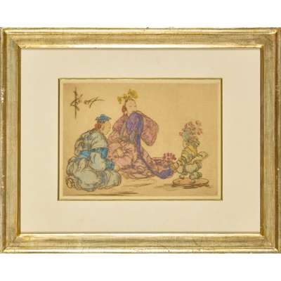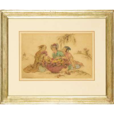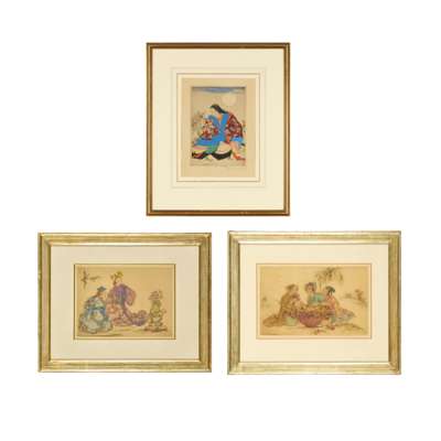 each hand-coloured and including 'THREE FLORISTS', 22cm x 33cm (frame size 44cm x 53cm); ‘ENTERTAINERS’, 22cm x 30cm (frame size 43cm x 53cm) and SEATED FIGURE, 26cm x 17.5cm (frame size 55.5cm x 46cm) (3)