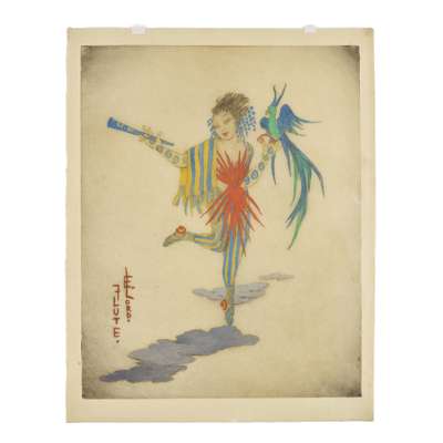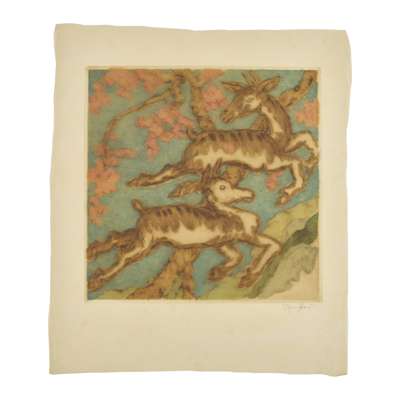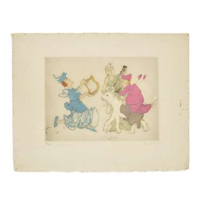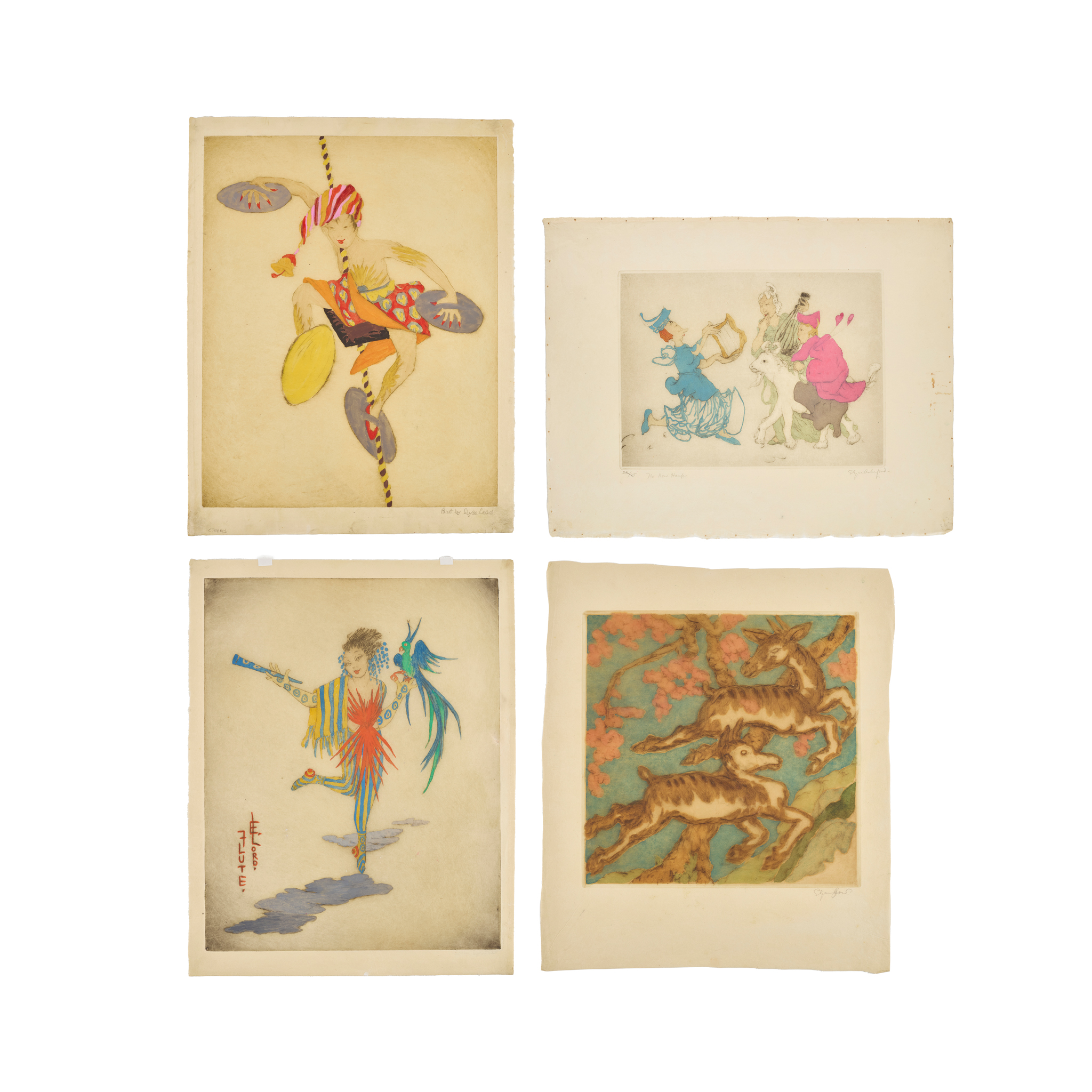 hand-coloured etching, inscribed, unframed, 48cm x 38cm; together with three further unframed hand-coloured etchings including ‘FLUTE, signed and titled in the plate, 48cm x 38cm; TWO FAWNS, signed, 30cm x 30cm; and ’THE NEW HARP', signed, titled and editioned 22/75, 26cm x 35cm (4)
