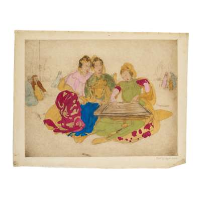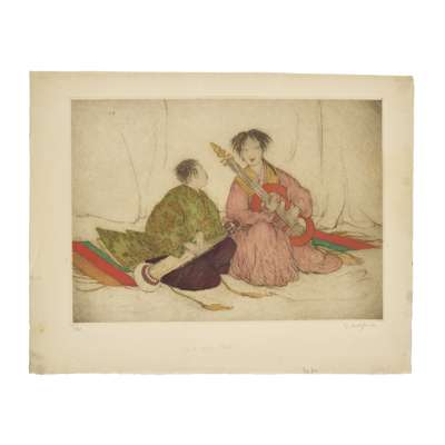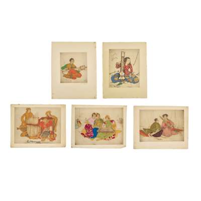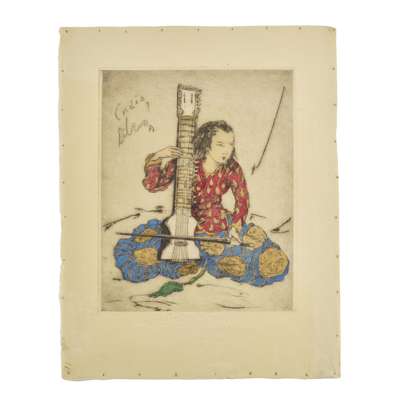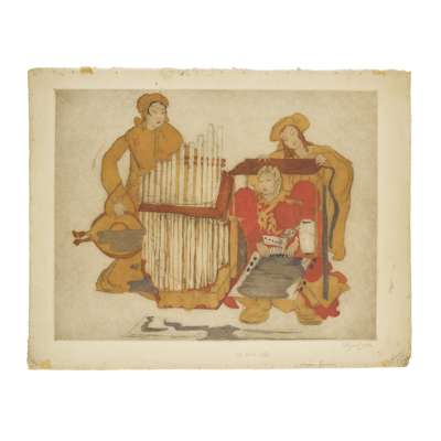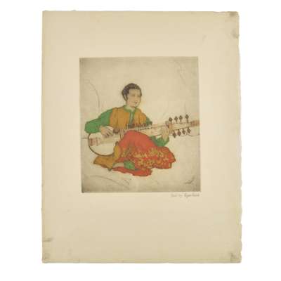 hand-coloured and gilded etching, signed and inscribed, 35cm x 45cm; together with four further unframed hand-coloured etchings including ‘JASS’, signed, inscribed and editioned 15/75, 31cm x 43cm; ‘SAROD PLAYER’, inscribed PRINT BY ELYSE LORD, 29cm x 25cm; 'THE GUZHENG', inscribed PRINT BY ELYSE LORD, 29cm x 25cm; and ‘INDIAN DILRUBA’, 24.5cm x 19cm (5)
