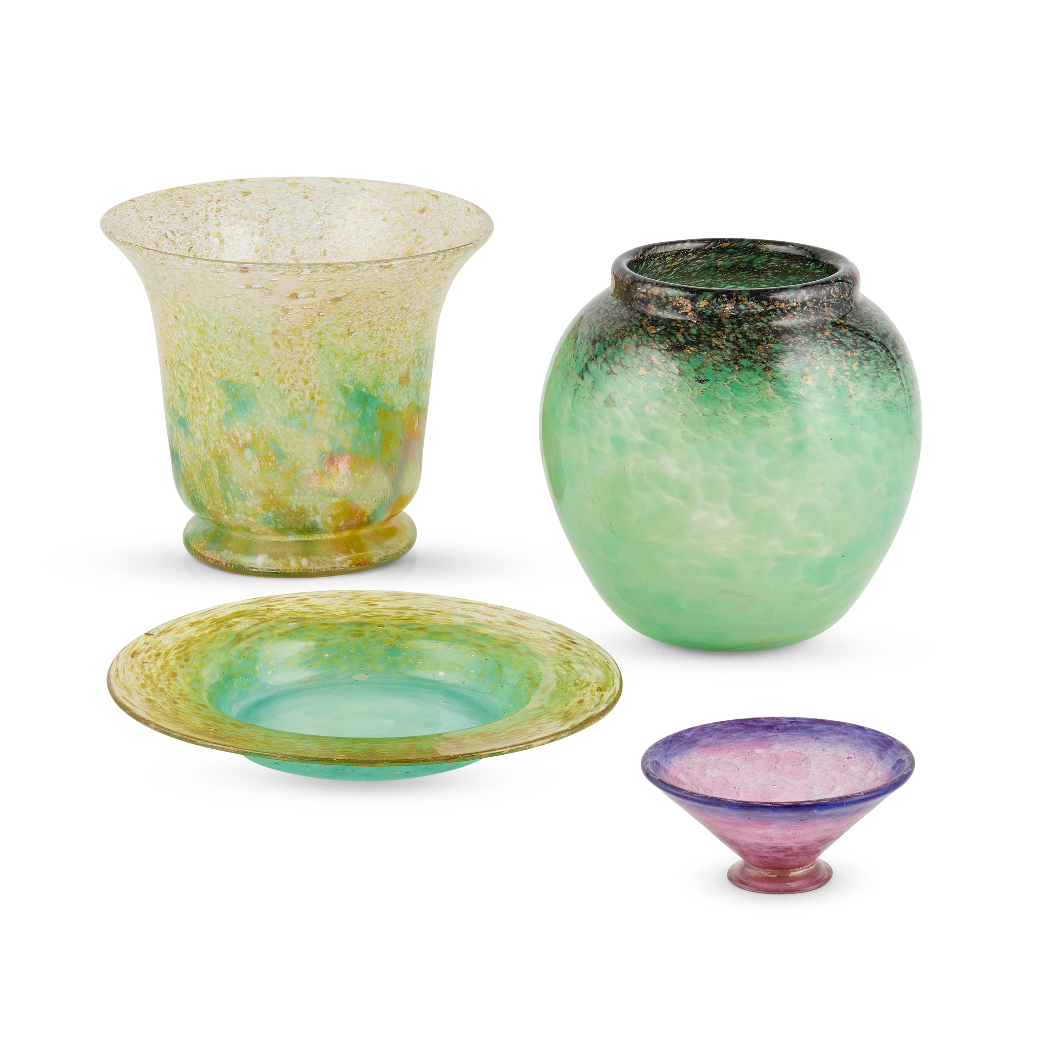 glass, green colourway, variously with black, orange, white and aventurine inclusions; together with a conical footed bowl in pink and blue glass, bears maker's paper label (3)