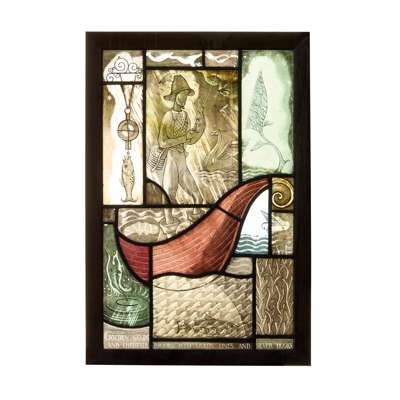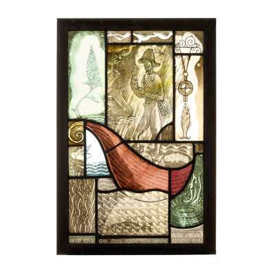 painted, stained and leaded glass, bears inscription GOLDEN SANDS AND CHRISTALL BROOKS WITH SILKEN LINES AND SILVER HOOKS, within an oak frame