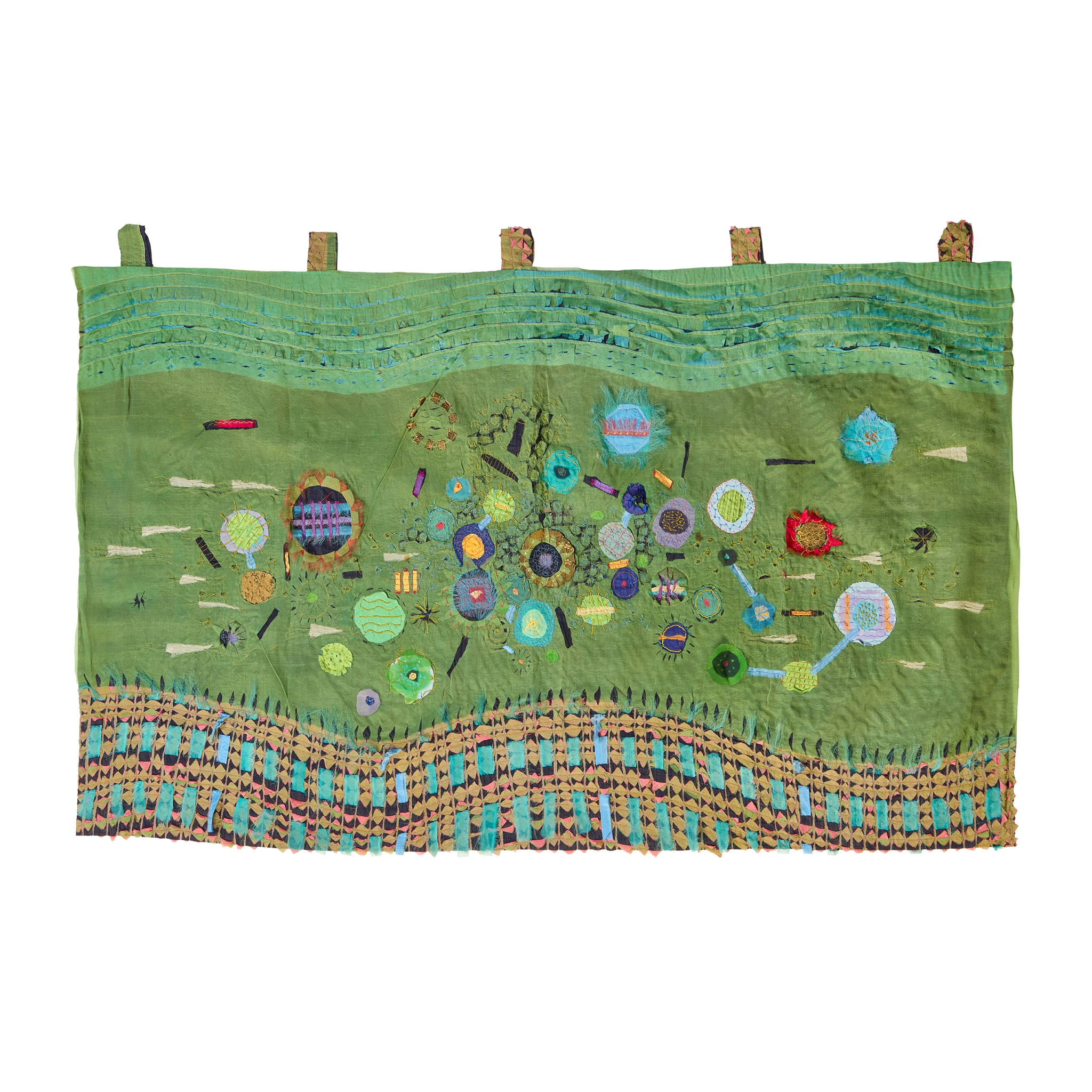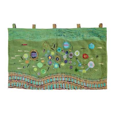 embroidered applique hanging, coloured silks, silk threads, lined