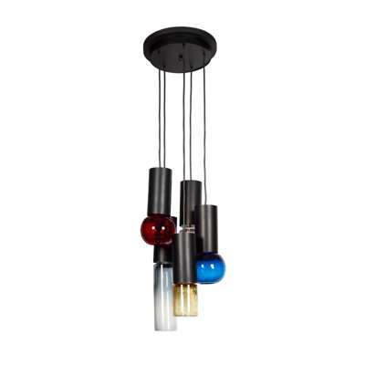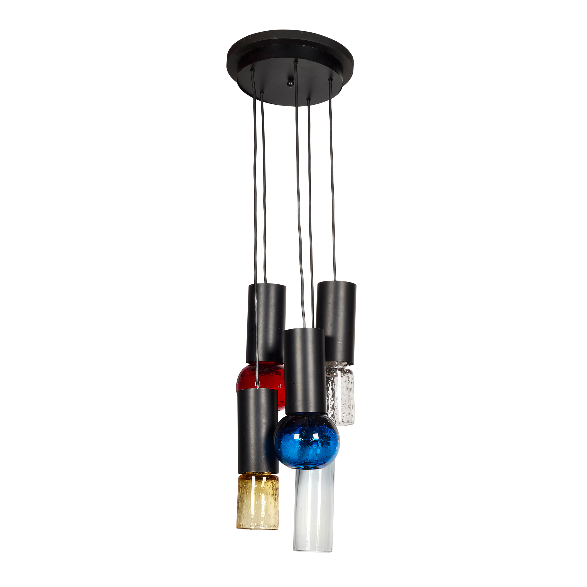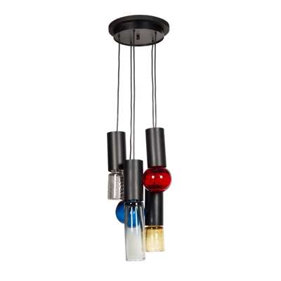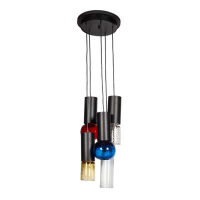 Winning the Design Centre Award in 1960, the Chelsea lighting fitting was seen as a new kind of decorative light due to the stark relationship between the sharp black metal and the thick coloured glass made by James Powell & Sons. The Design Journal described the light as “attractive whether the lamps are alight or not, and the effect is rich when the specially designed bulb throws light downwards into the hand-blown crystal glass, which can be clear, amber, pale rose or pale blue”.