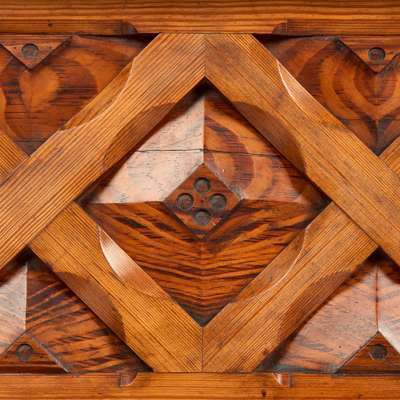 pitch pine, with original tooled leather writing surface and steel fittings