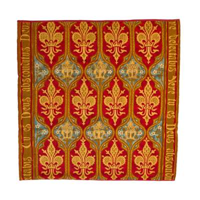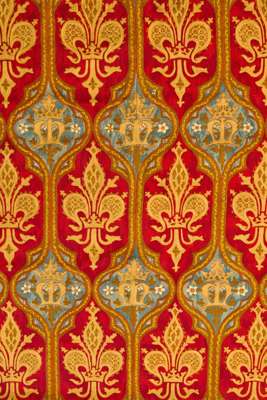 Between 1863 and 1866, Edward Welby Pugin converted the remains of a medieval palace, once owned by the Archbishops of Canterbury, into Mayfield School of the Holy Child. One significant work from this time is a needlework carpet or runner that covered the entire Chapel floor. Due to its large size, the rug was made in small sections and then stitched together. It was hand-sewn by the sisters of Mayfield Chapel for Mother Cornelia Connelly, the founder of the Society of the Holy Child Jesus. Pugin likely used decorative designs created by his father, as he did in other projects.
