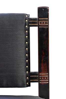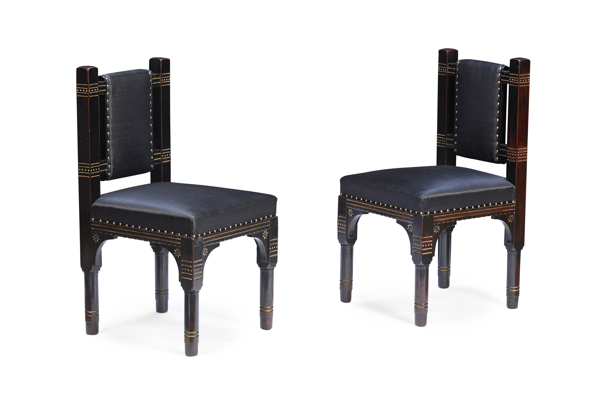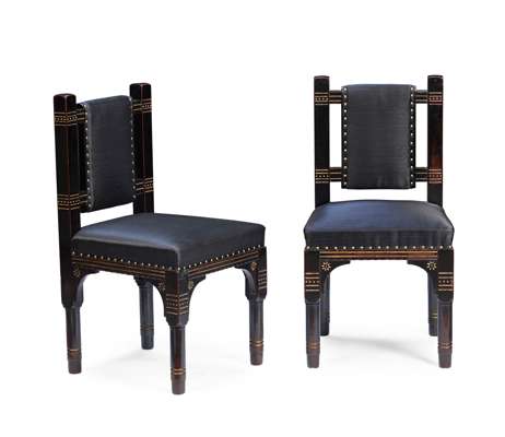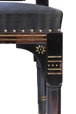 ebonised wood, with incised and gilded decoration and upholstered seats and backs (2)