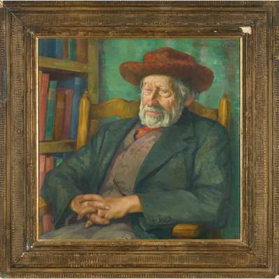 Kenneth Center was the studio assistant of Mackmurdo’s friend and mentor Sir Frank Brangwyn for many years and another of his extant works is a portrait of Brangwyn. It is thought however that Brangwyn's picture was painted posthumously, using a photograph of Mackmurdo for reference. This photograph shows the designer sitting in the same armchair to the one depicted in both Brangwyn's portrait and the current lot.
