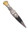 with marks for Edinburgh 1918, maker RWF, also stamped RW Forsyth Ltd, Glasgow & Edinburgh, 8.8cm single fuller blade, the silver mounts cast with Celtic strapwork, with thistle carved cairngorm pommel, contained in a leather scabbard, with matching decoration and central circular plaque, crested